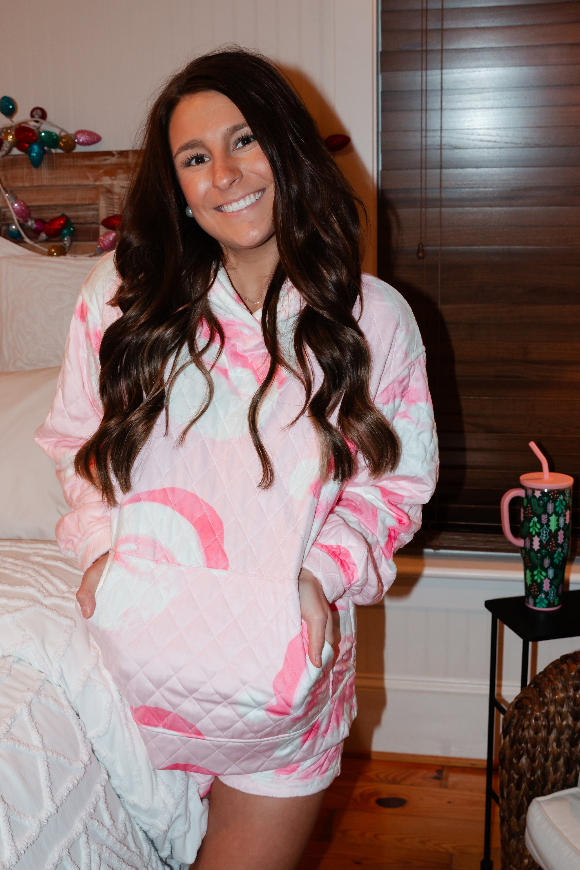 Wrap yourself in warmth and whimsy with this PJ top, crafted from super soft and fuzzy quilted material. The delightful watercolor Santa faces add a playful touch to the pretty pink design, making it perfect for the holiday season. Featuring a cozy hoodie style and a convenient front pocket, this top provides both comfort and functionality. Pair it with the matching shorts for a complete look that's as stylish as it is snug.