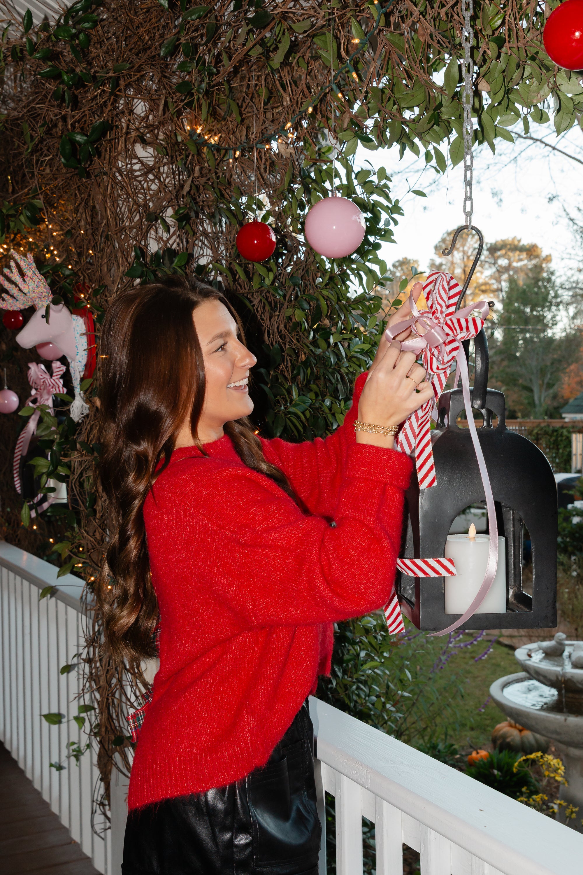 This sweater is crafted from a super soft fuzzy knit material, enveloping you in unparalleled warmth and comfort. Its Christmas red color is vibrant, capturing the festive spirit of the season. The front showcases a charming plaid bow design, adding a classic holiday touch. Matching plaid ties run elegantly down the back, making this sweater a perfect choice for holiday gatherings or cozy nights by the fire.
