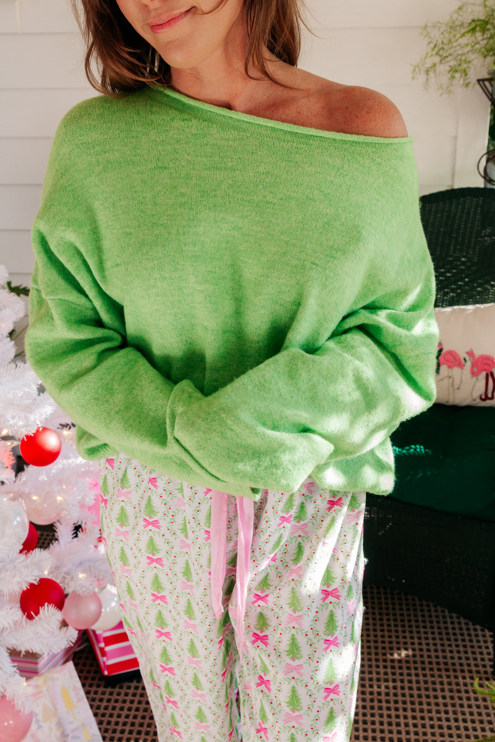 This sweater boasts a luxuriously soft knit material that feels gentle against the skin, making it a comfortable choice for any occasion. Its vibrant lime green color adds a refreshing pop to your wardrobe, effortlessly brightening up any outfit. With a cozy vibe, this sweater can be easily paired with jeans or your favorite pj’s for a laid-back look, or dressed up with a skirt and accessories for a more polished ensemble. Whether you're lounging at home or heading out for a night on the town, this versatile piece ensures you stay stylish and comfortable.