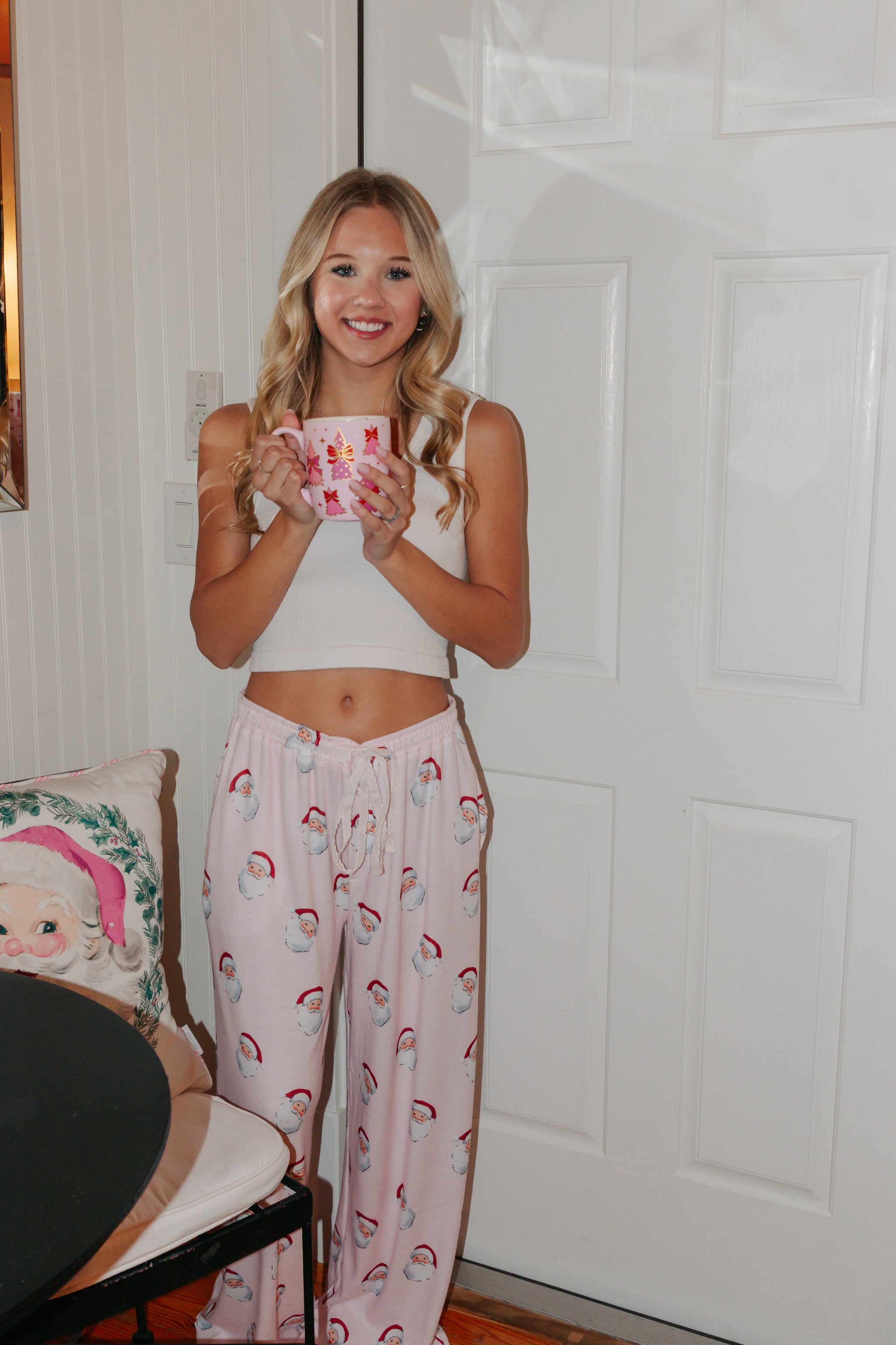 These delightful PJ pants are crafted from an ultra-comfy pink material adorned with charming little Santa faces, making them a festive addition to your holiday wardrobe. Designed with practicality in mind, they feature convenient pockets for storing your essentials. The elastic waistband ensures a snug fit, while a delicate lace ribbon tie adds a touch of elegance. Perfect for lounging by the fireplace or enjoying a cozy night in, these pants effortlessly combine style and comfort.