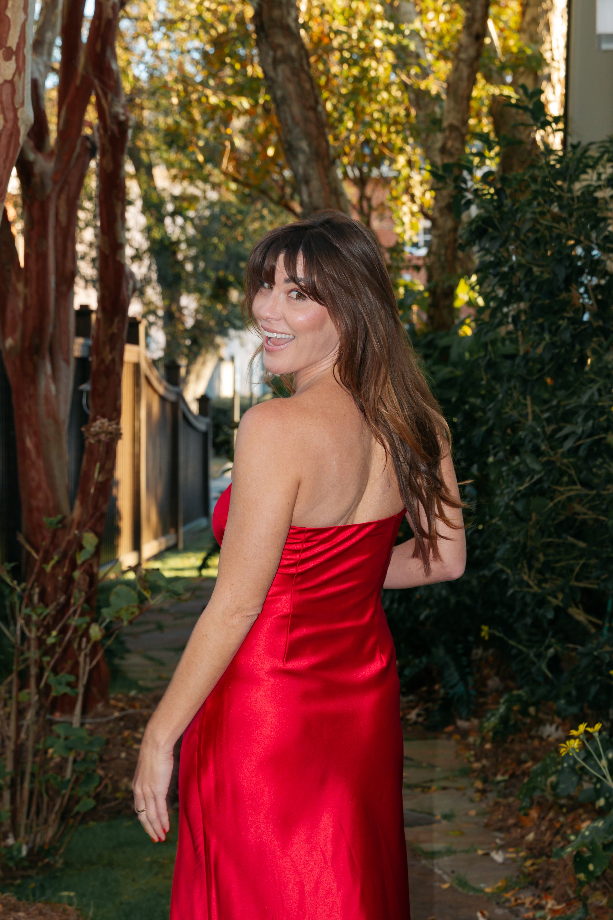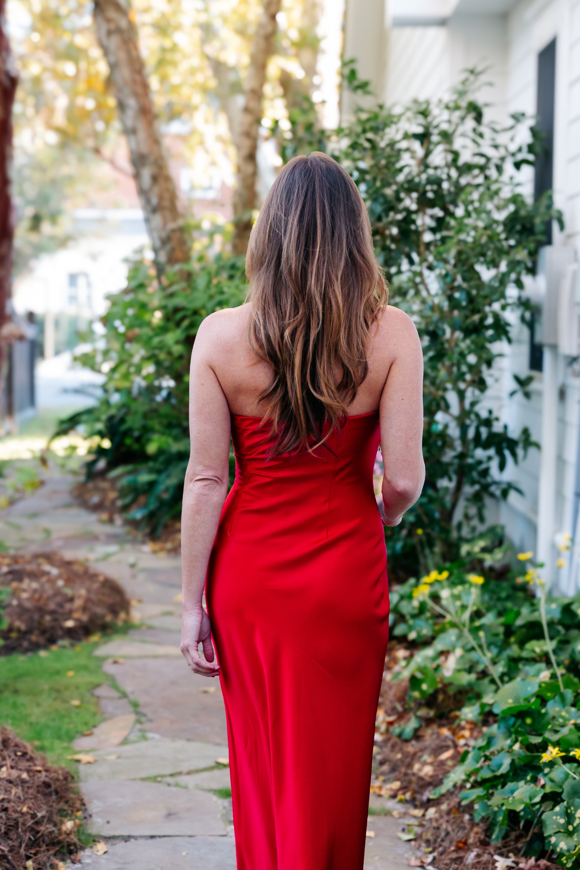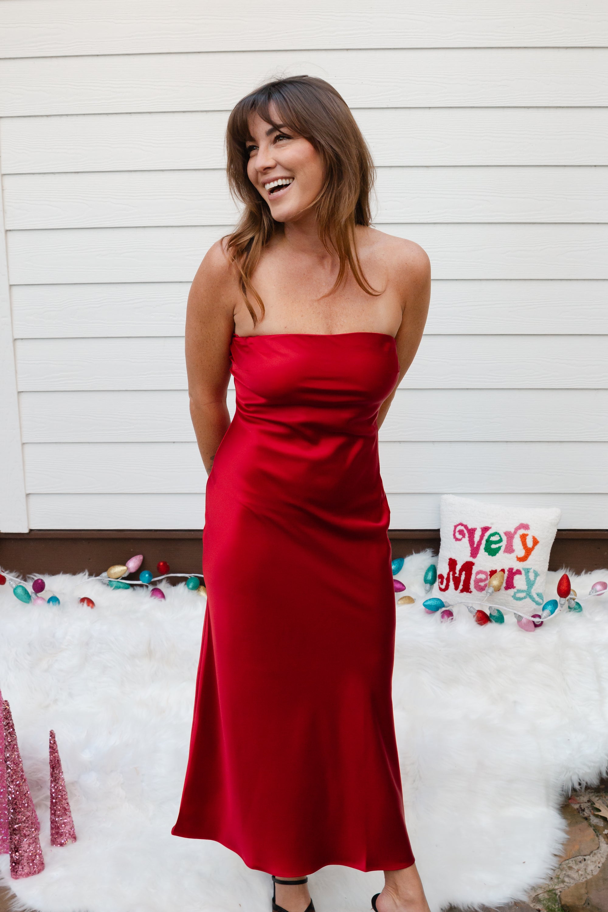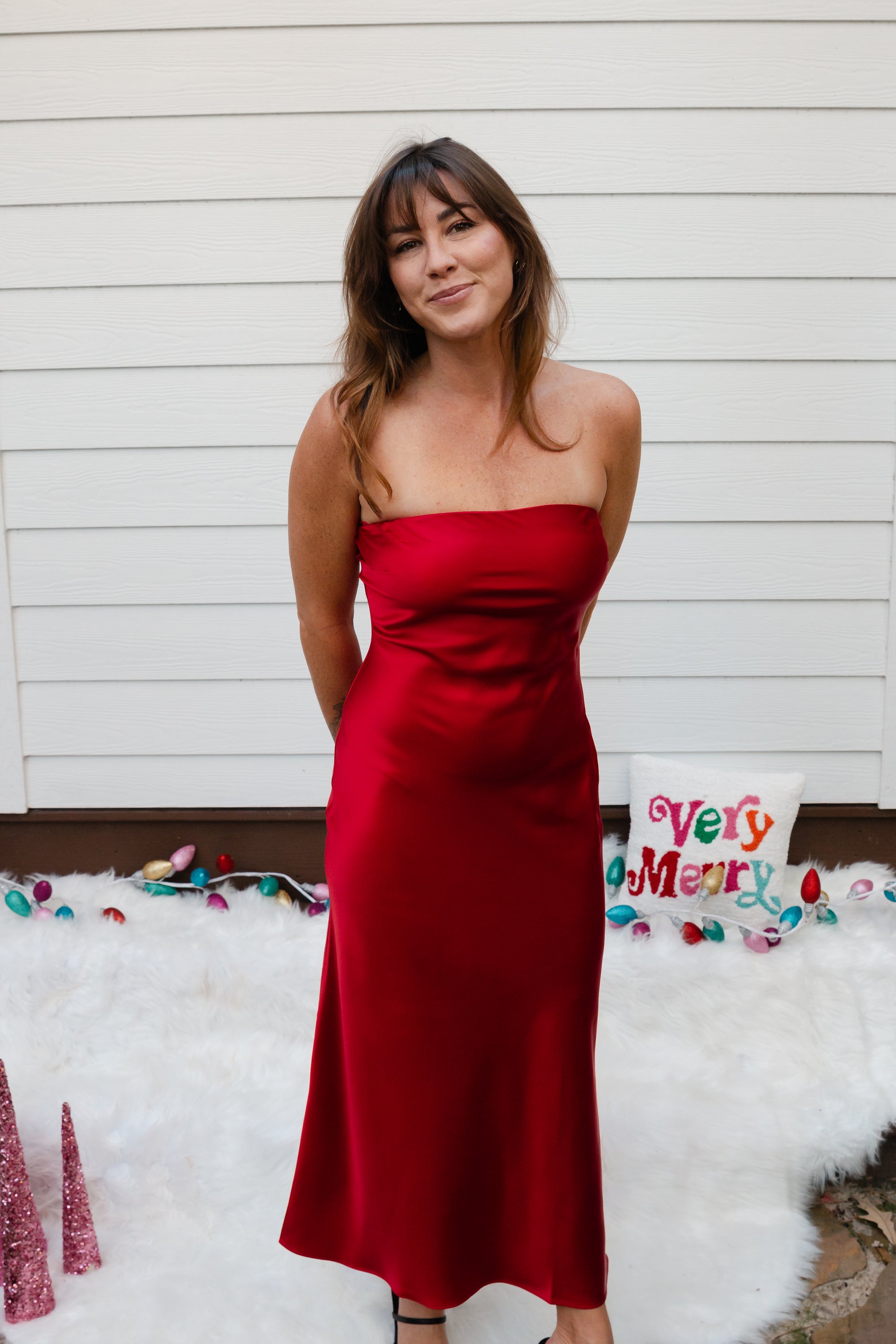 This stunning dress is crafted from a soft, silky satin material that glides effortlessly over the skin, offering a luxurious feel and an elegant appearance. Designed with a strapless fit, it accentuates the shoulders and neckline, creating a timeless and sophisticated silhouette. The maxi length adds an air of grace and drama, perfect for making a grand entrance at your next holiday party. With its sleek design and sumptuous fabric, this dress ensures you will look and feel like the epitome of holiday glamour.