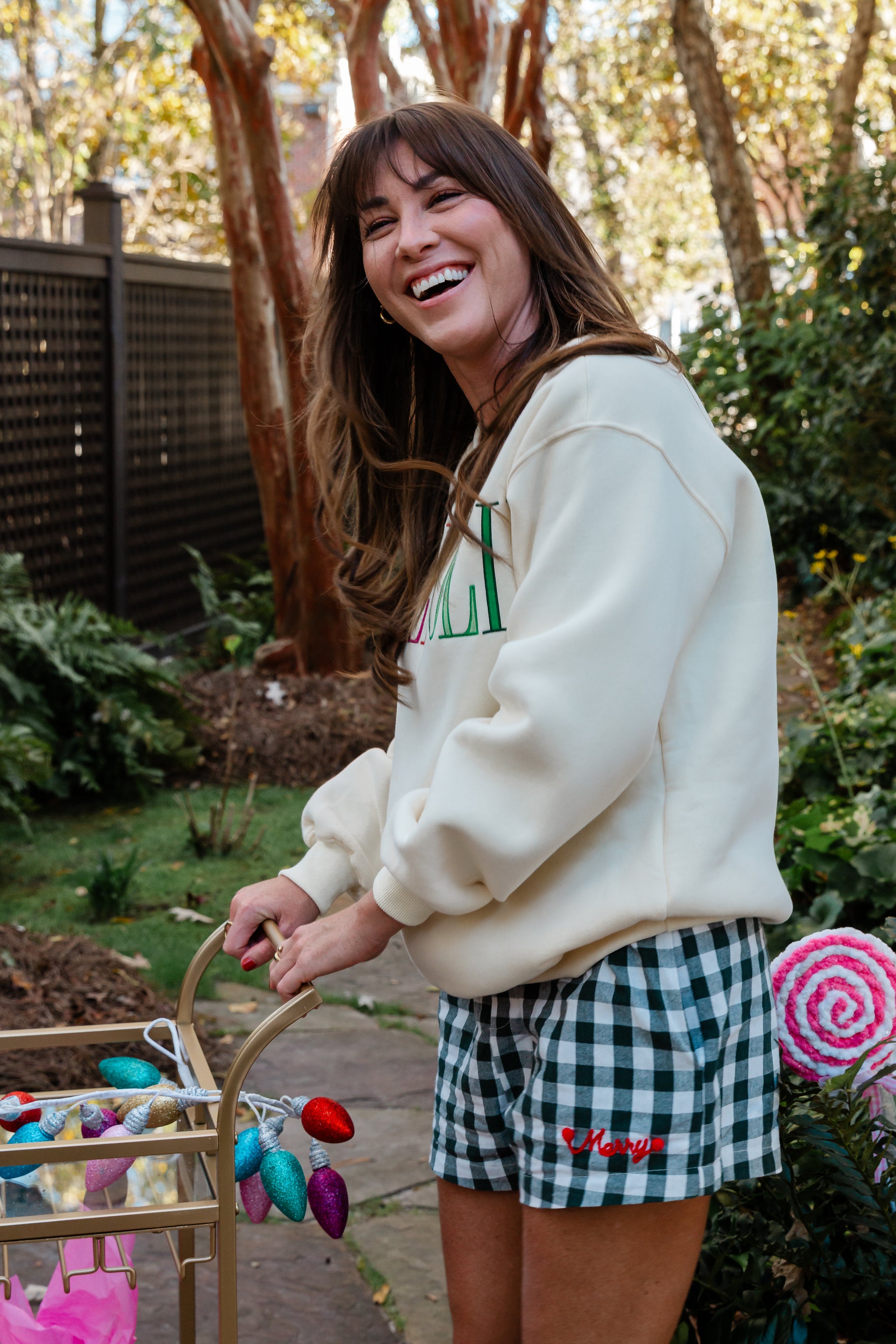 These delightful PJ shorts are crafted from a soft gingham material that exudes a classic, cozy charm perfect for the holiday season. The elastic waistband ensures a comfortable fit, allowing you to move freely while enjoying festive activities or simply lounging at home. Delicately stitched into the front is the cheerful word “Merry,” adding a touch of whimsy and warmth to your sleepwear ensemble. Accented with playful pom poms, these shorts bring an extra dash of festive fun, making them a charming addition to your Christmas wardrobe.