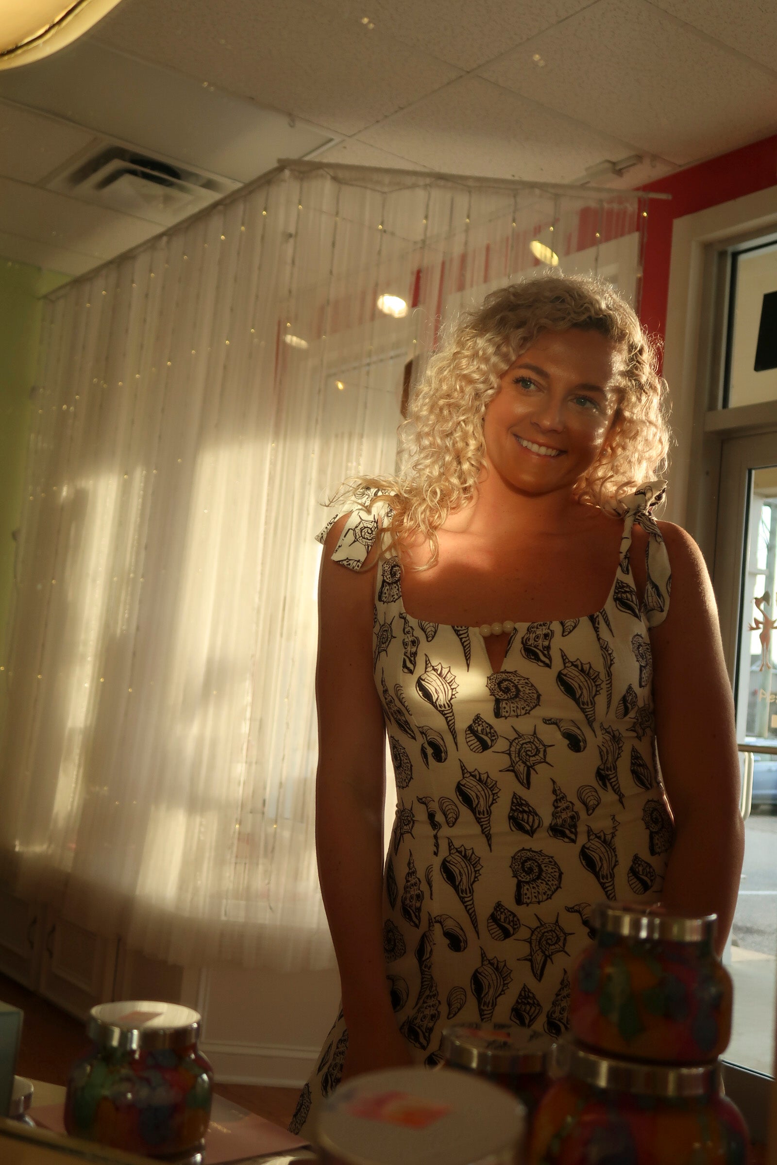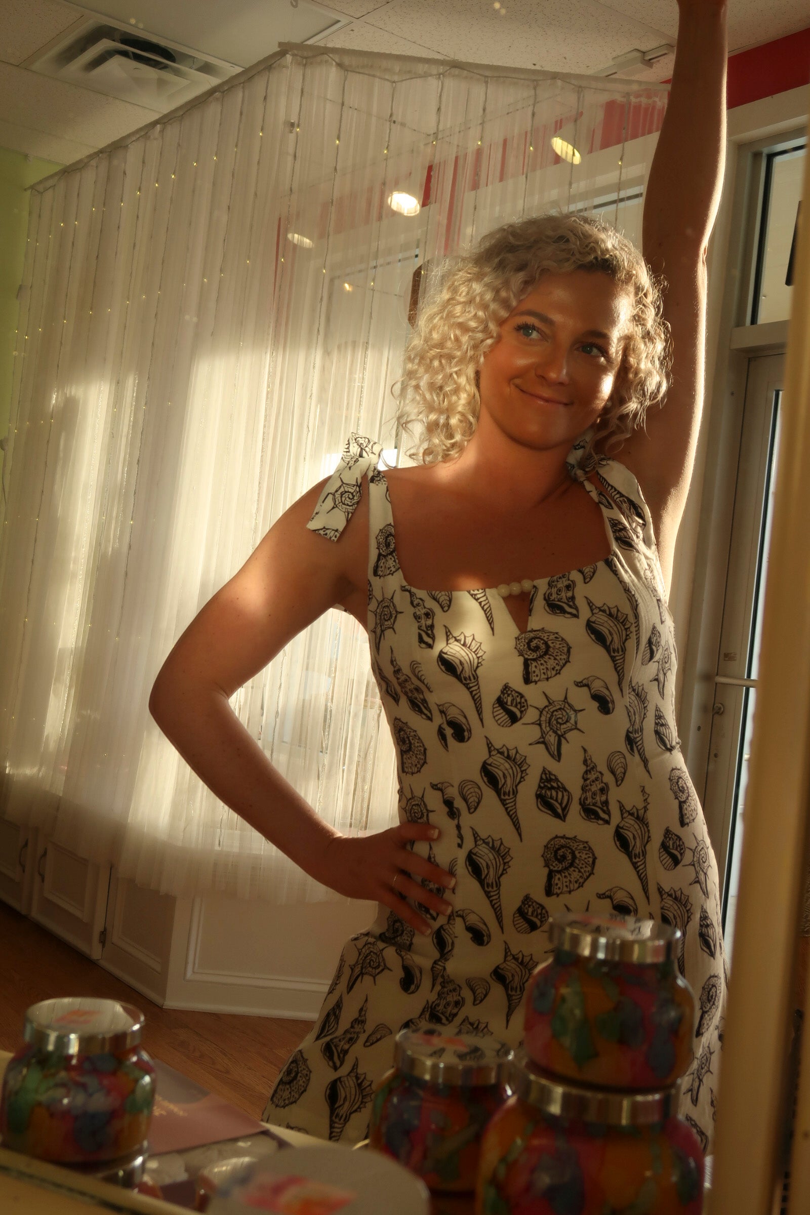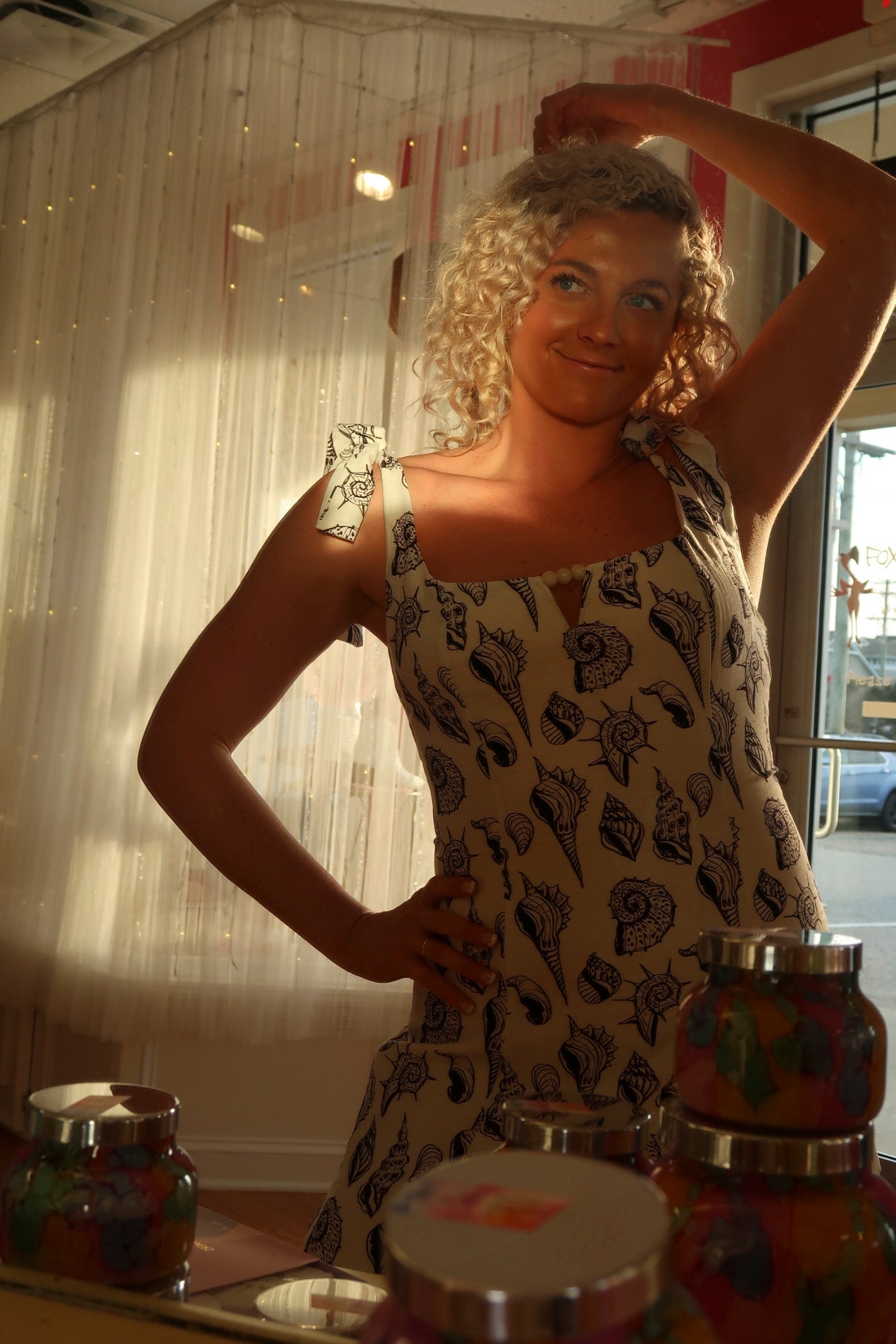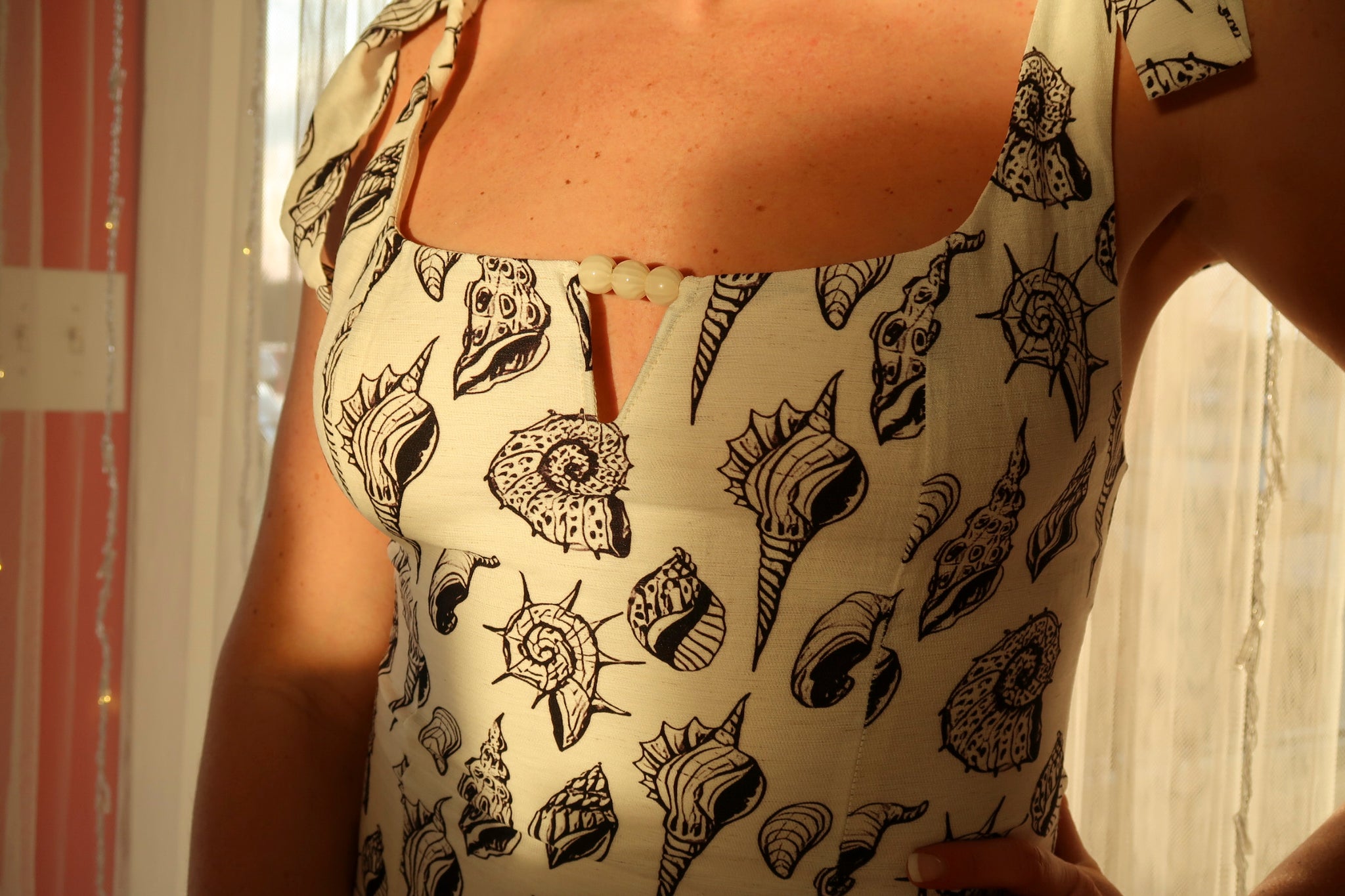 This captivating mini dress showcases delicate tie straps, adding a touch of elegance and versatility to its design. Crafted from a light woven material adorned with unique black seashell designs, it exudes a coastal charm perfect for warm, sunny days. The neckline features an enchanting keyhole with bead embellishments, offering a one-of-a-kind detail that elevates the overall look. Whether you're heading to a beachside gathering or a casual outing, this dress promises to keep you stylish and comfortable.