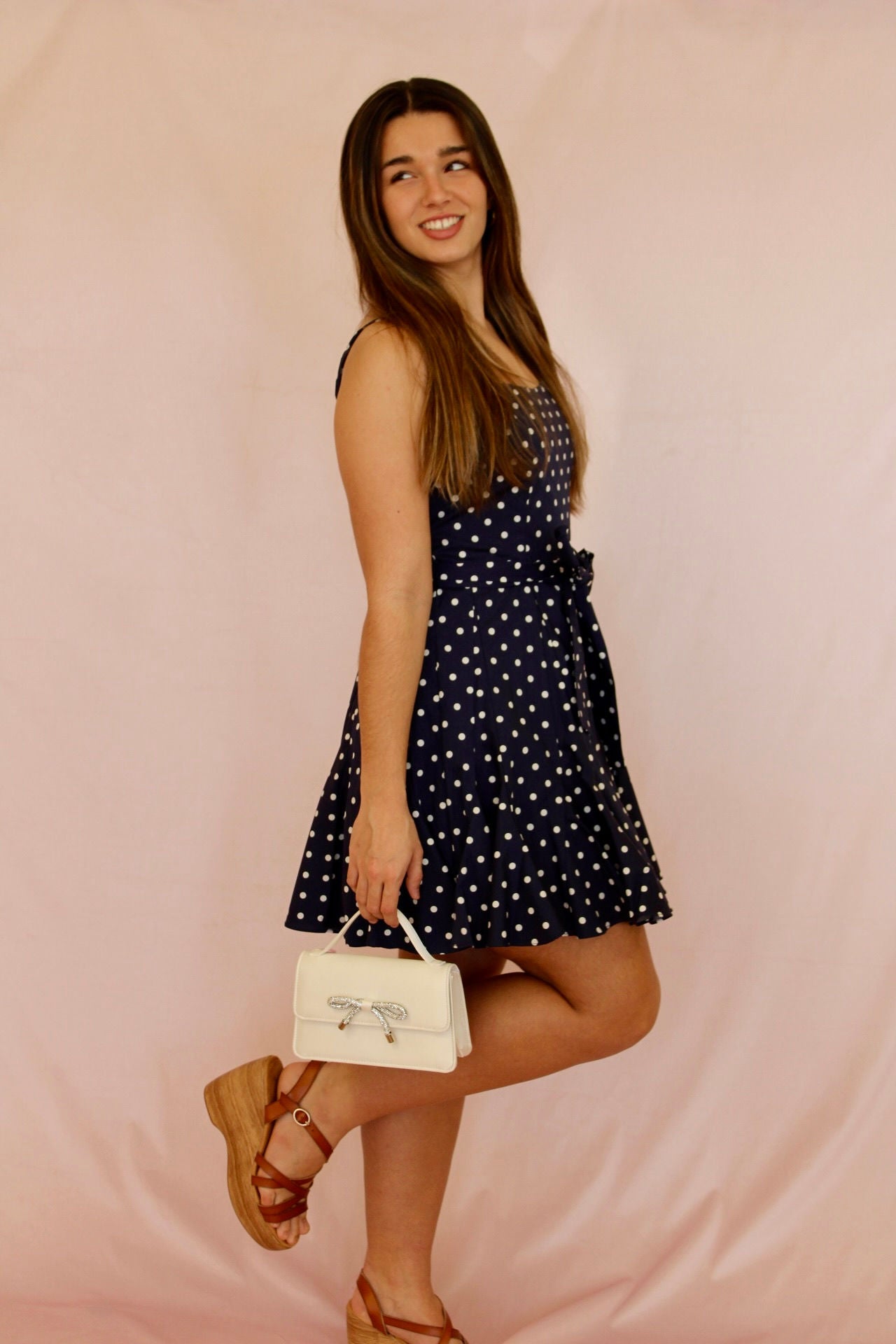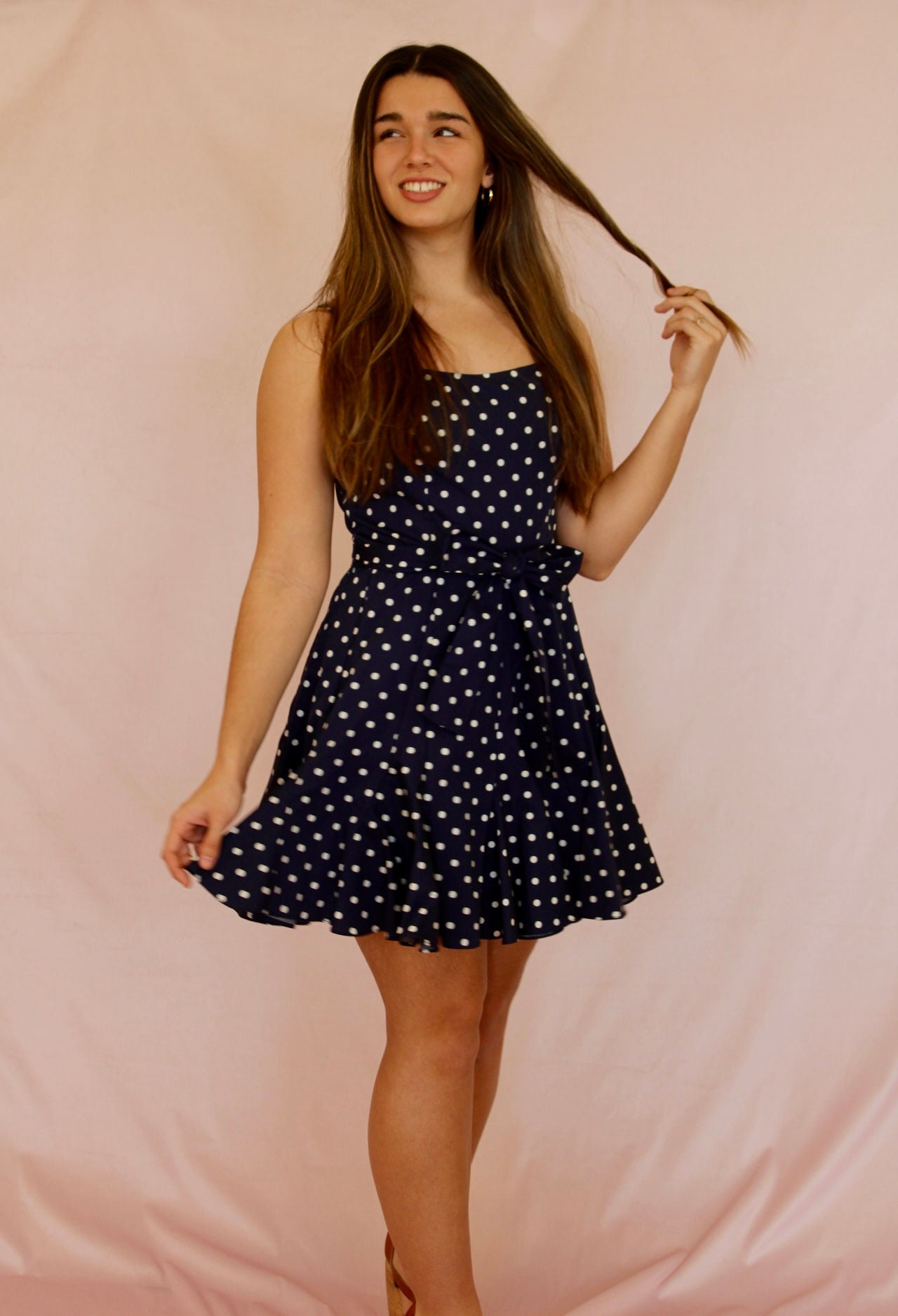 Introducing our Timeless Navy Polka Dot Mini Dress, an elegant piece that captures the essence of classic style. The dress showcases a rich navy color adorned with charming white polka dots, exuding a playful yet sophisticated aura. With a delicate tie around the waist, it accentuates your silhouette, offering a flattering fit. Adjustable straps ensure comfort and versatility, while the scalloped pleated skirt adds a touch of whimsy, making this mini dress a true timeless staple in any wardrobe.