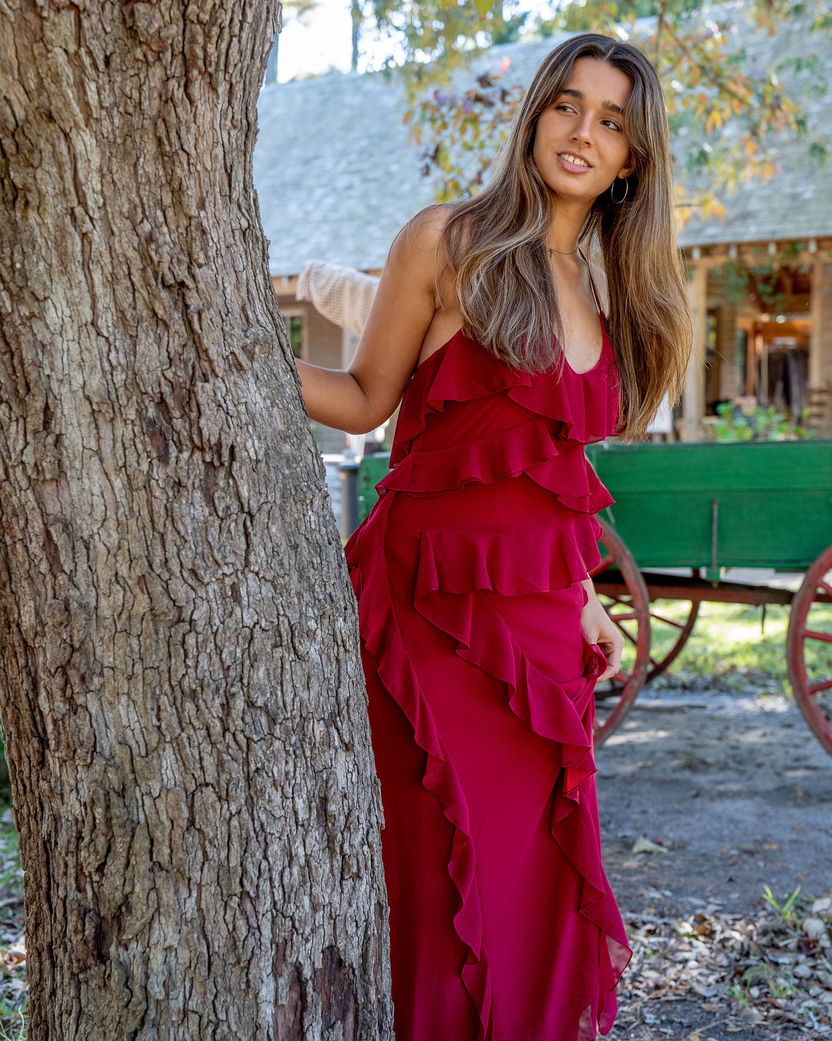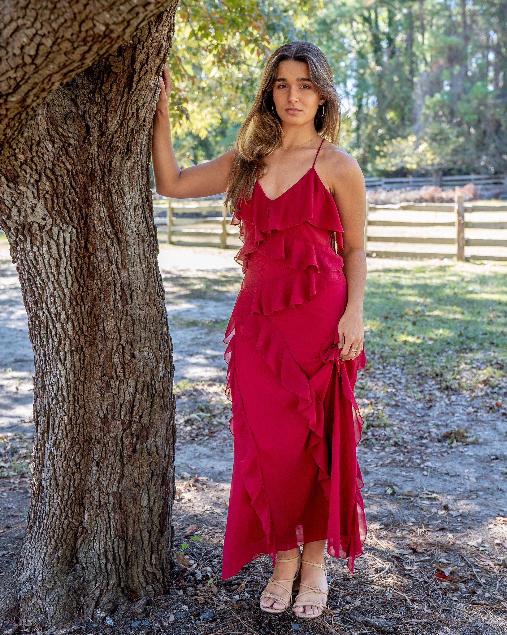 This stunning maxi dress features a captivating ruby red color that is sure to turn heads at any event. Flowing ruffles cascade down the front of the dress, adding a romantic and elegant touch to its design. The maxi length offers a graceful silhouette, making it an ideal choice for a sophisticated wedding guest outfit. Adjustable tie straps cross delicately in the back, providing both a personalized fit and an exquisite detail that enhances the overall allure of the dress.