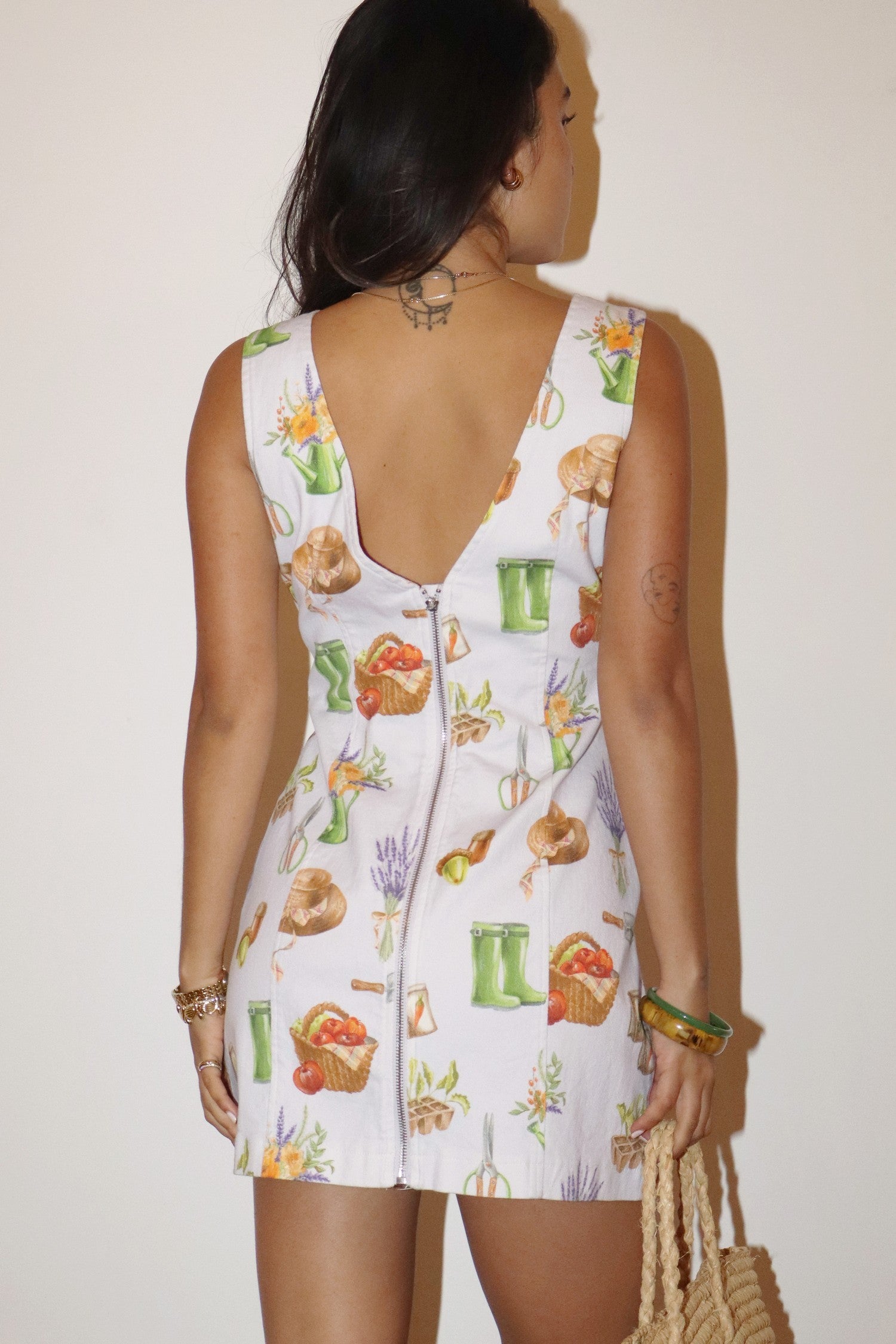 This delightful mini dress is crafted from soft denim material, offering both durability and a chic look. Its pale lavender hue is adorned with a charming print of gardening tools and blossoming flowers, celebrating the beauty of springtime. The dress features a boat neckline with a striking plunge back, accentuated by a sleek zipper that adds a modern edge. Designed with a sleeveless cut, it's an ideal choice for enjoying the warm, sunny days of spring.