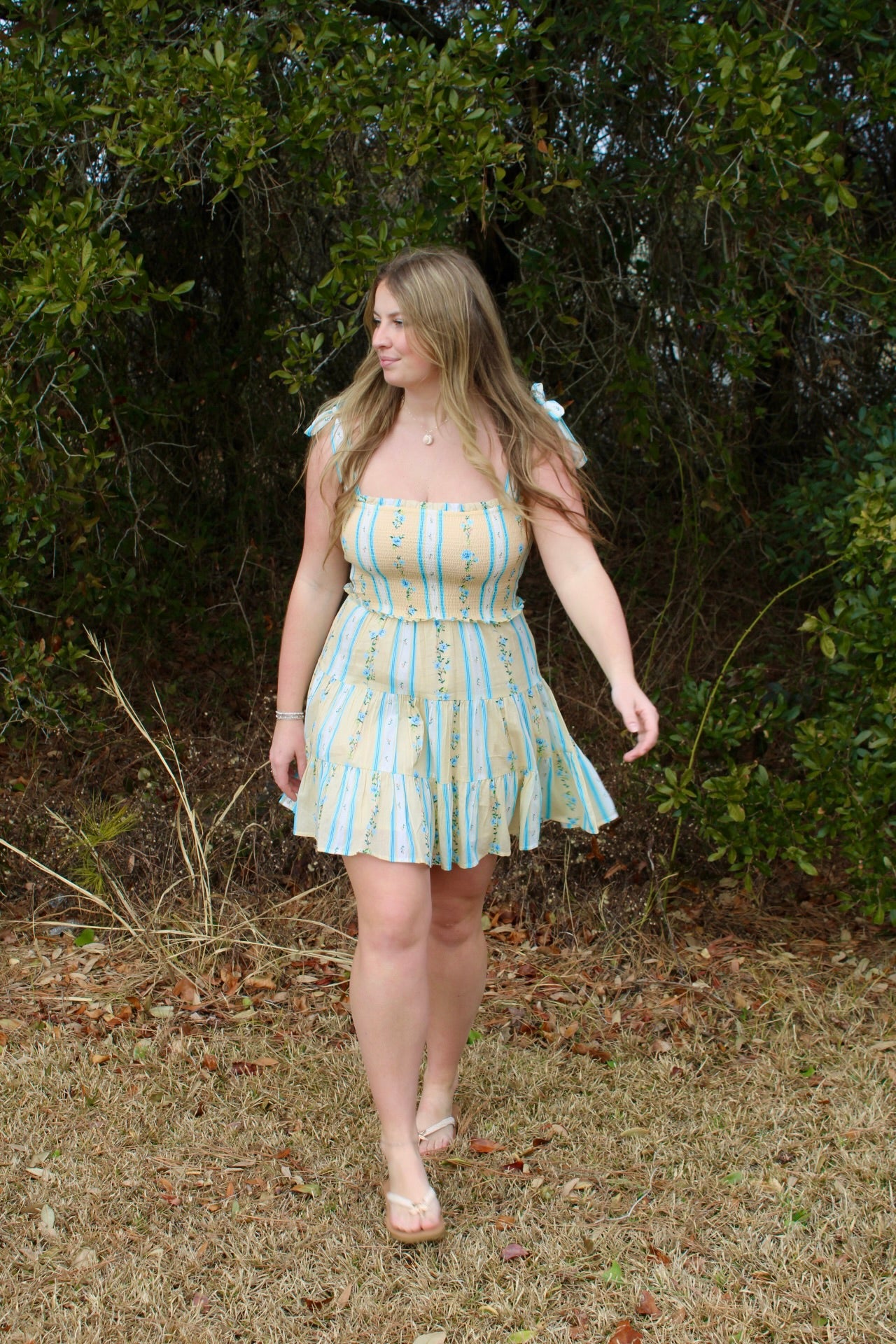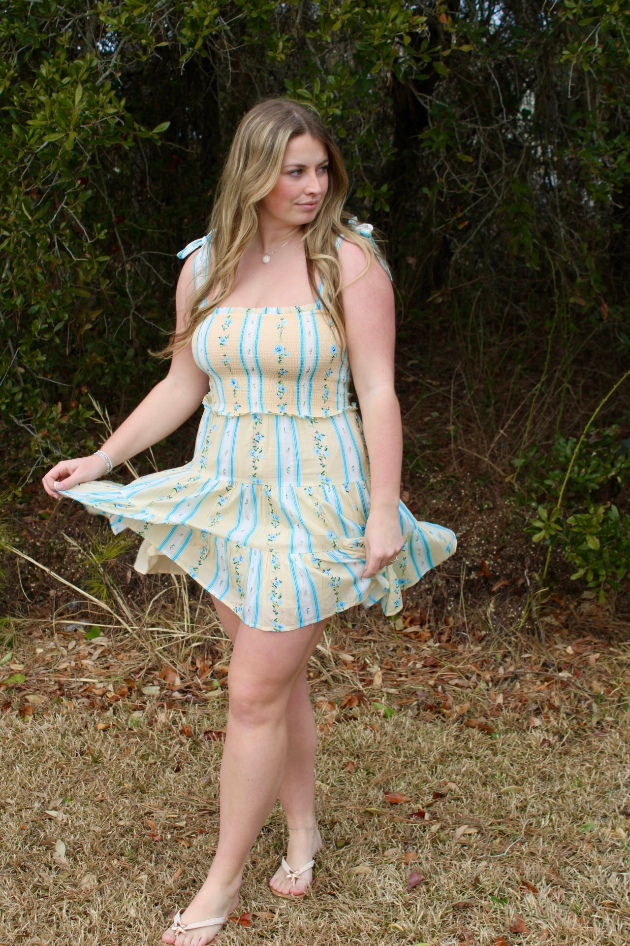 This enchanting dress features a smocked bodice that provides a comfortable fit while accentuating the figure with its delicate texture. The pale yellow and blue vertical stripes create a refreshing and cheerful look, perfect for embracing the warmth of spring. Adorned with intricate floral details, the dress adds a touch of whimsy and elegance to your wardrobe. Its tie straps allow for a customizable fit, while the lightweight woven cotton material ensures breathability and comfort during those sunny spring days.