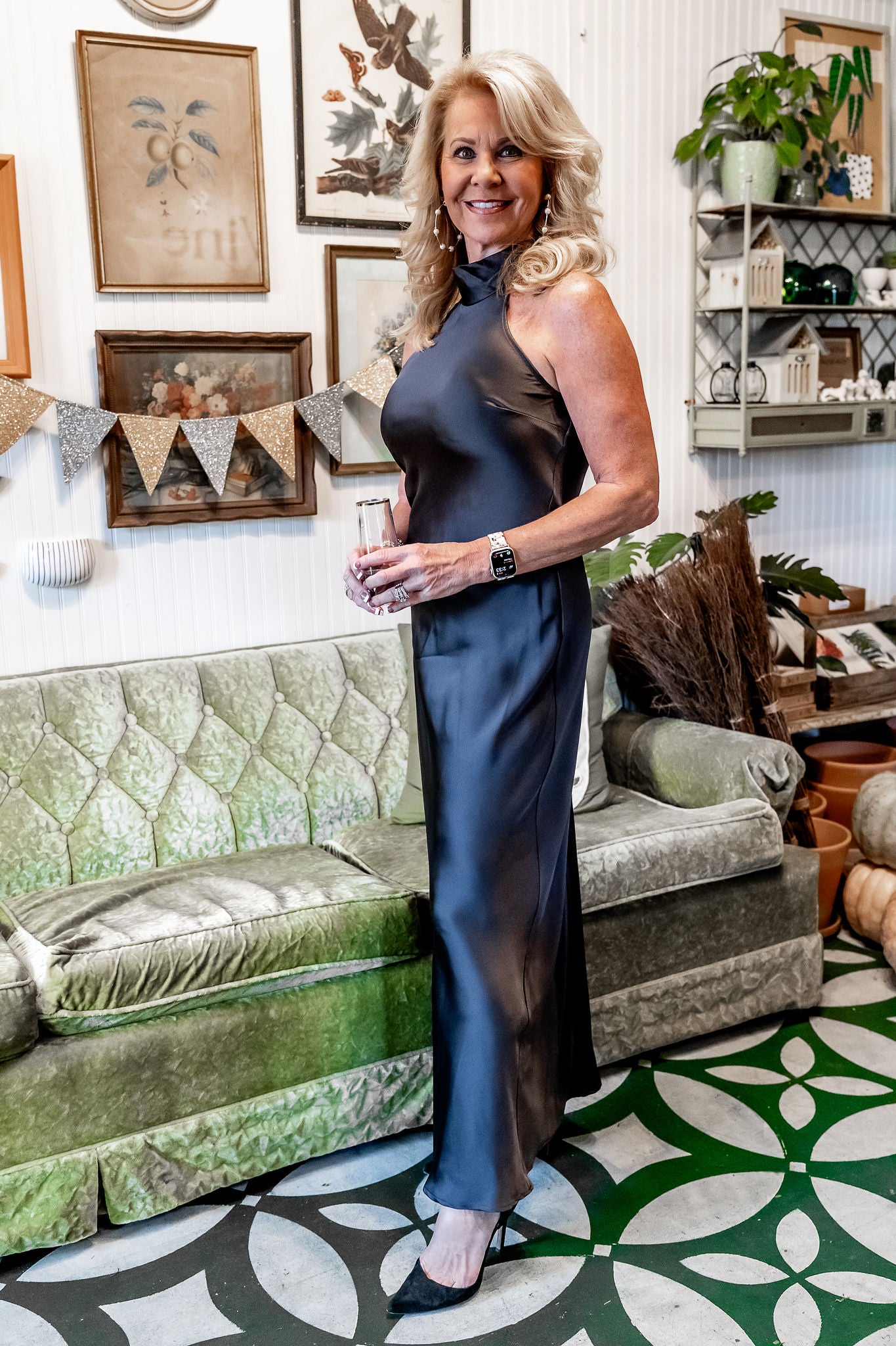This elegant maxi dress features a sophisticated halter neckline, accentuated by a luxurious satin tie at the back of the neck, offering a graceful silhouette. Its dark slate color exudes an air of mystery and allure, making it a stunning choice for evening events. Crafted from soft satin material, the dress drapes effortlessly, ensuring comfort and style throughout the night. Perfect for parties or formal gatherings, this dress combines timeless elegance with modern chic.
