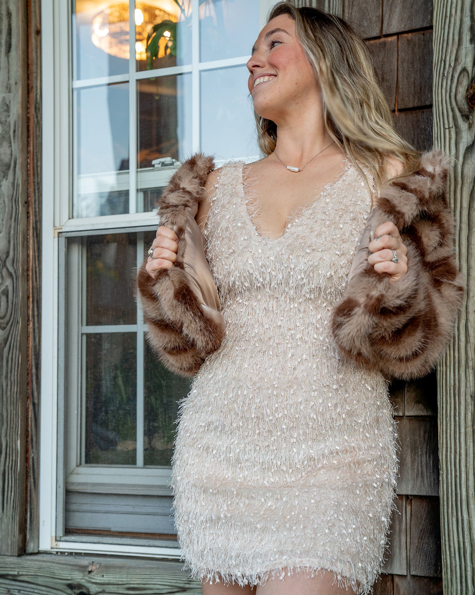 This captivating mini dress is crafted from an exquisite feather-like material that feels as luxurious as it looks, offering a unique and textural appeal. Its elegant bateau neckline provides a touch of sophistication, gracefully framing the face while maintaining a chic and modern silhouette. The rich ivory hue enhances its timeless charm, making it a versatile choice that can be styled for both formal gatherings and casual outings. Perfect for winter occasions, this one-of-a-kind dress effortlessly combines warmth and style, ensuring you stand out wherever you go.