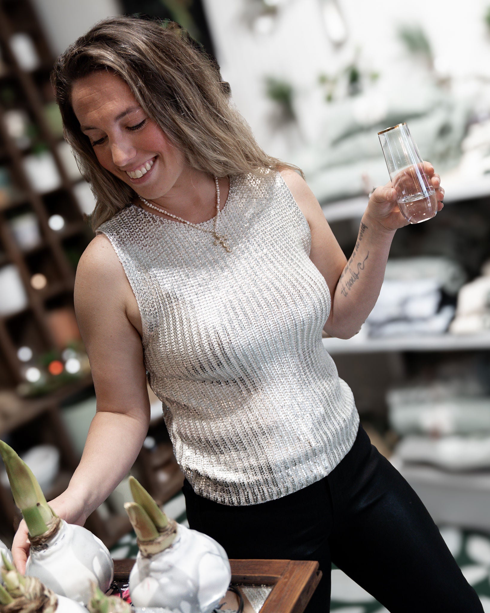 This stunning top boasts a luxurious knit material adorned with a dazzling silver coating, making it the ideal choice for any occasion. The sweater vest fit offers a versatile silhouette that pairs effortlessly with everything from casual jeans to elegant skirts. Its shimmering finish elevates the look, allowing you to dress it up with statement jewelry or keep it chic and understated for a more laid-back vibe. Whether you're heading to a casual brunch or a sophisticated evening event, this top ensures you'll shine in style.