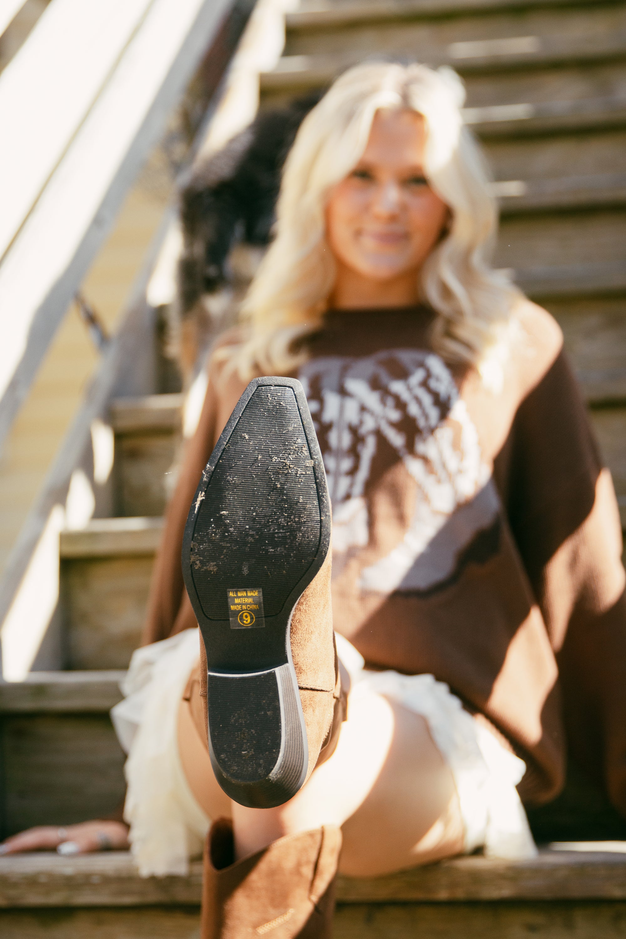 These charming cowgirl boots showcase a luxurious soft suede material, offering both comfort and style. Intricate stitching designs dance across the boots, adding a touch of artistry and elegance to your ensemble. The beautiful chocolate color harmonizes perfectly with the warm hues of fall, making them an ideal choice for the season. Whether you're two-stepping at a concert or strolling through autumn leaves, these boots are sure to make a statement.
