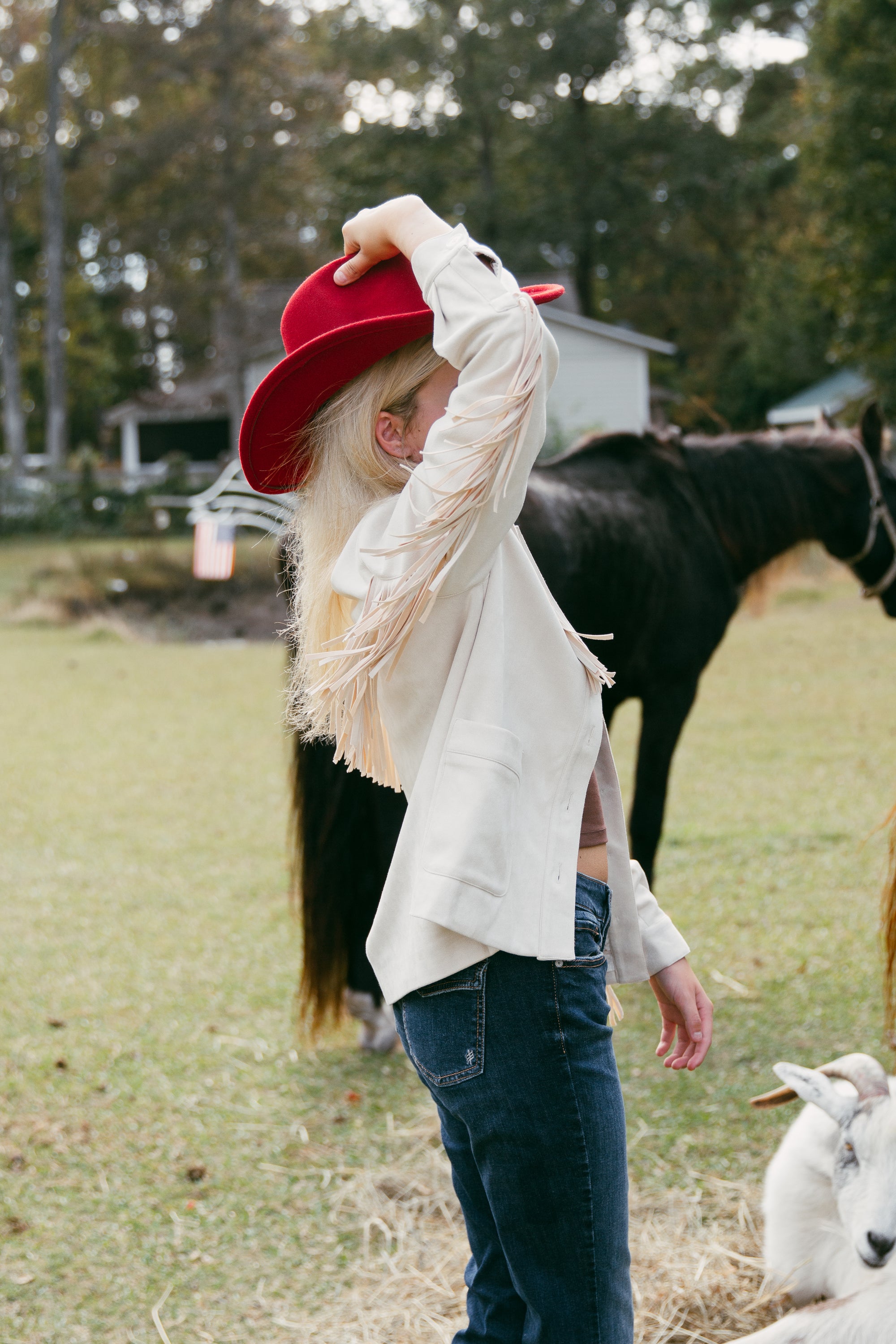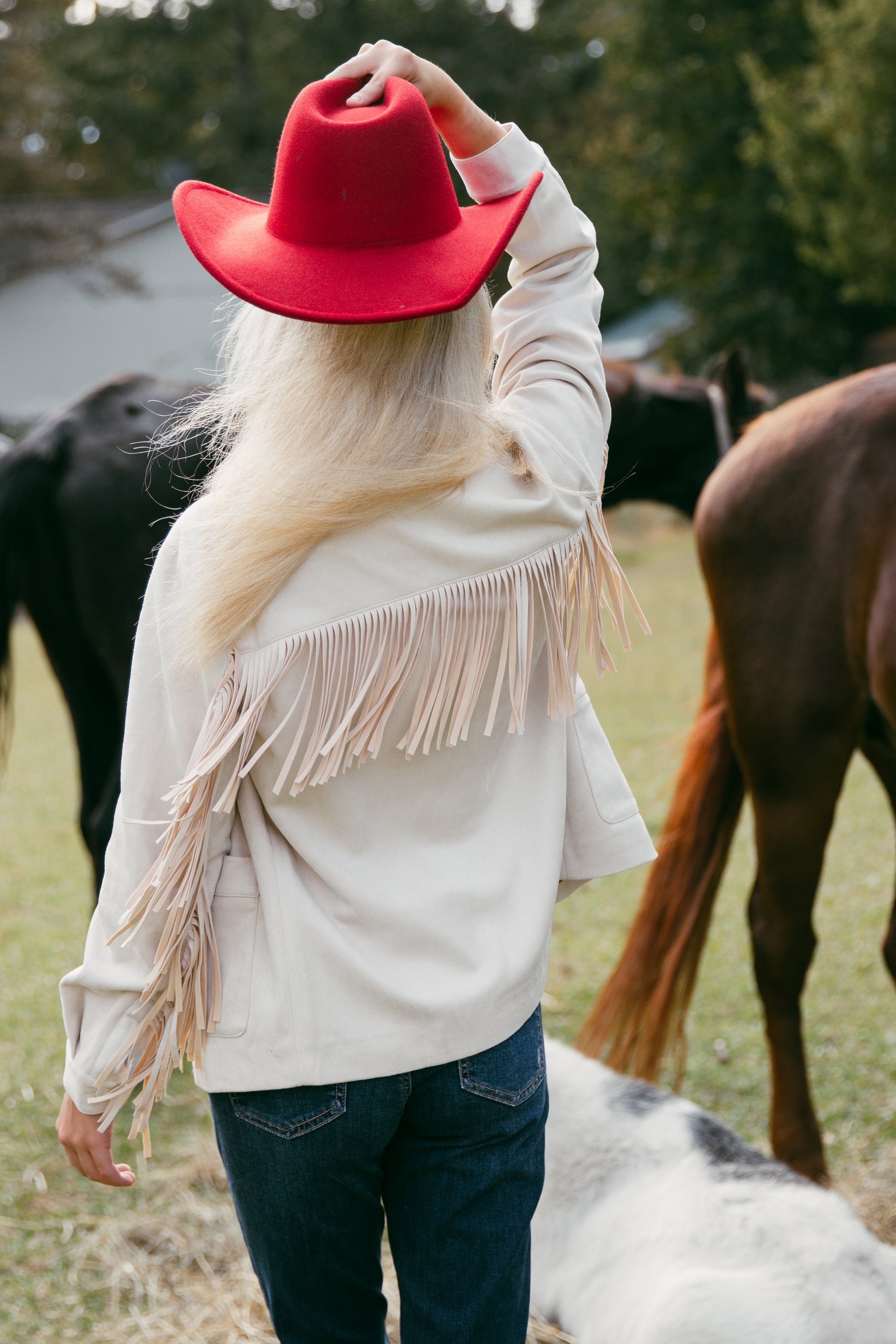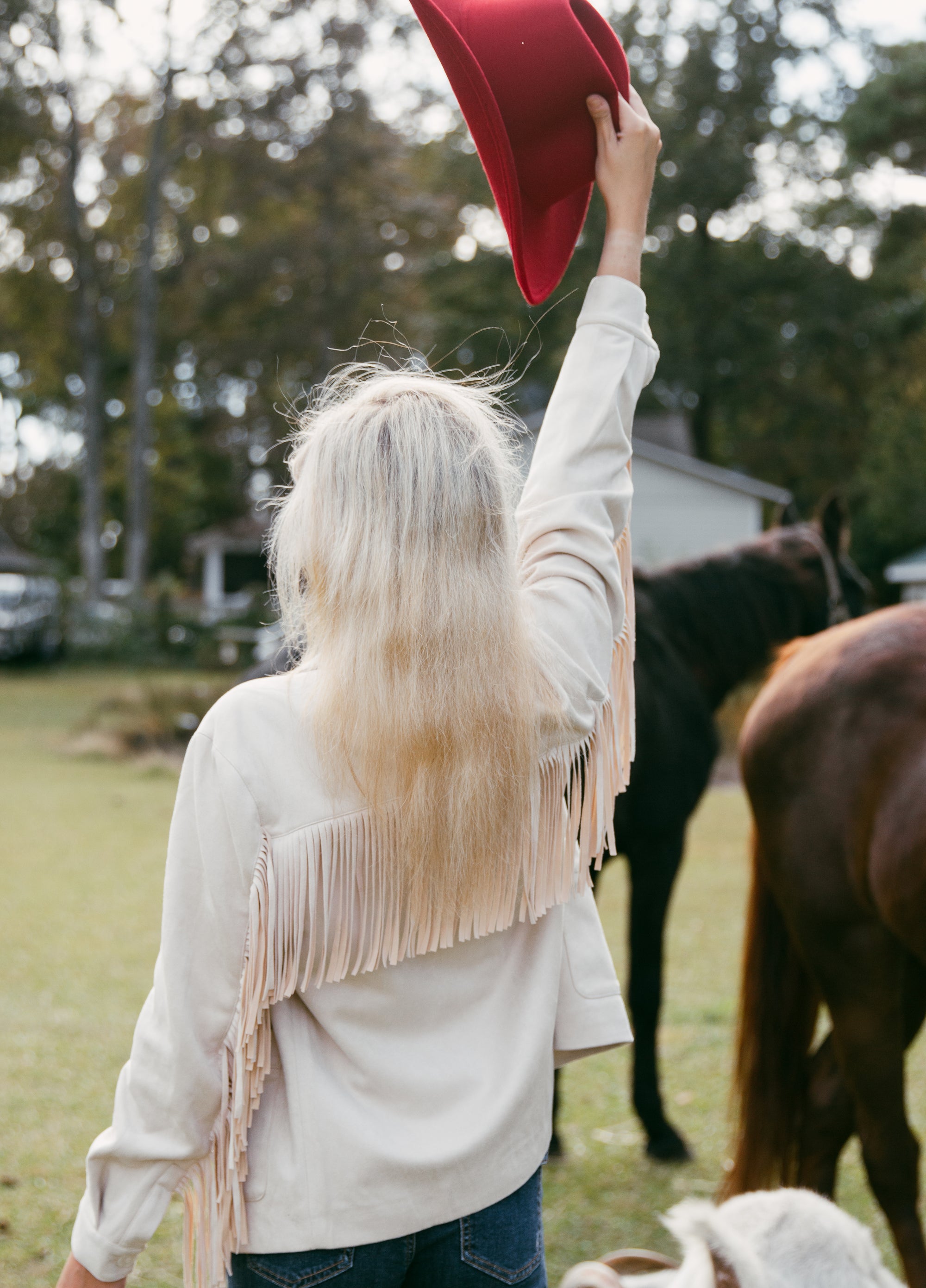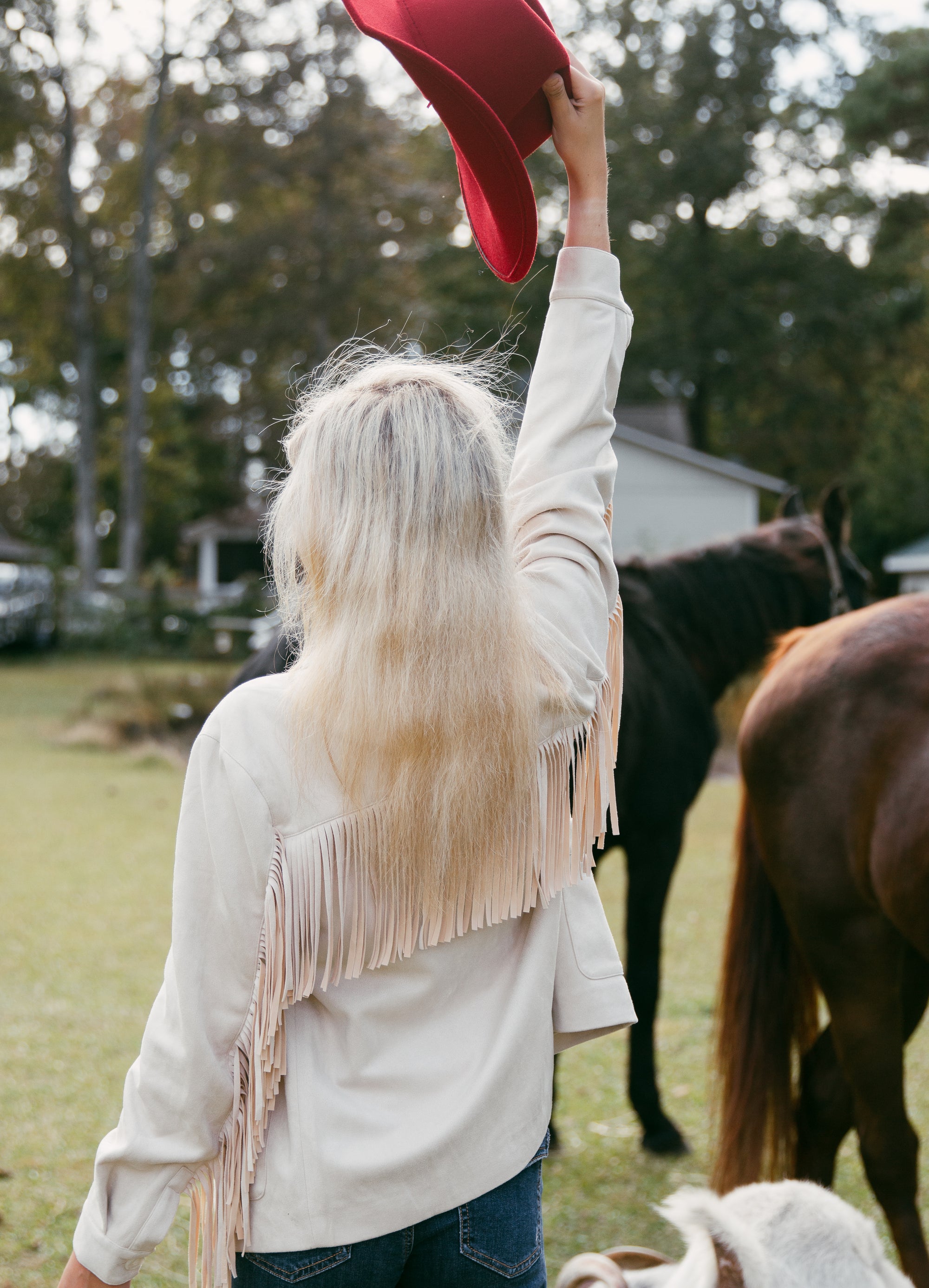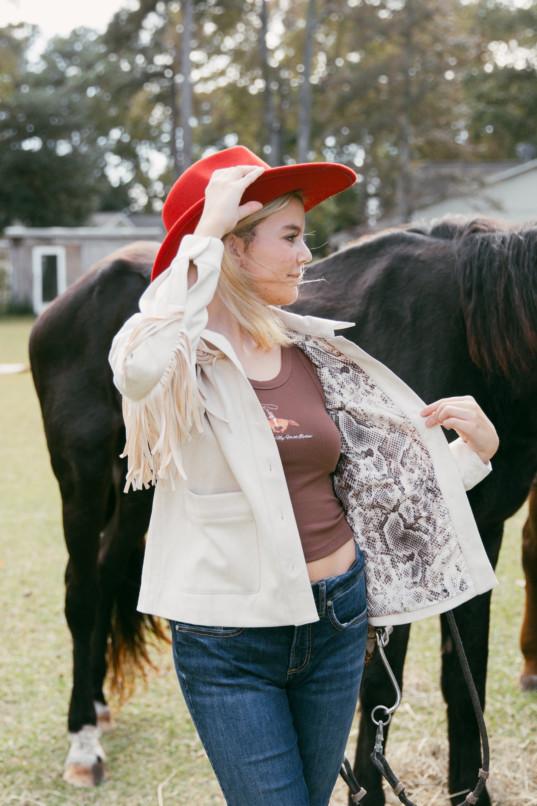 This jacket radiates understated elegance with its light cream hue, perfectly complementing its sumptuous suede material. Fringe details cascade along the front and back, adding a dynamic and eye-catching element to its design. Inside, the jacket surprises with a luxurious snakeskin lining, offering a hint of exotic flair. Practical front pockets not only enhance its functionality but also contribute to its chic and polished aesthetic.