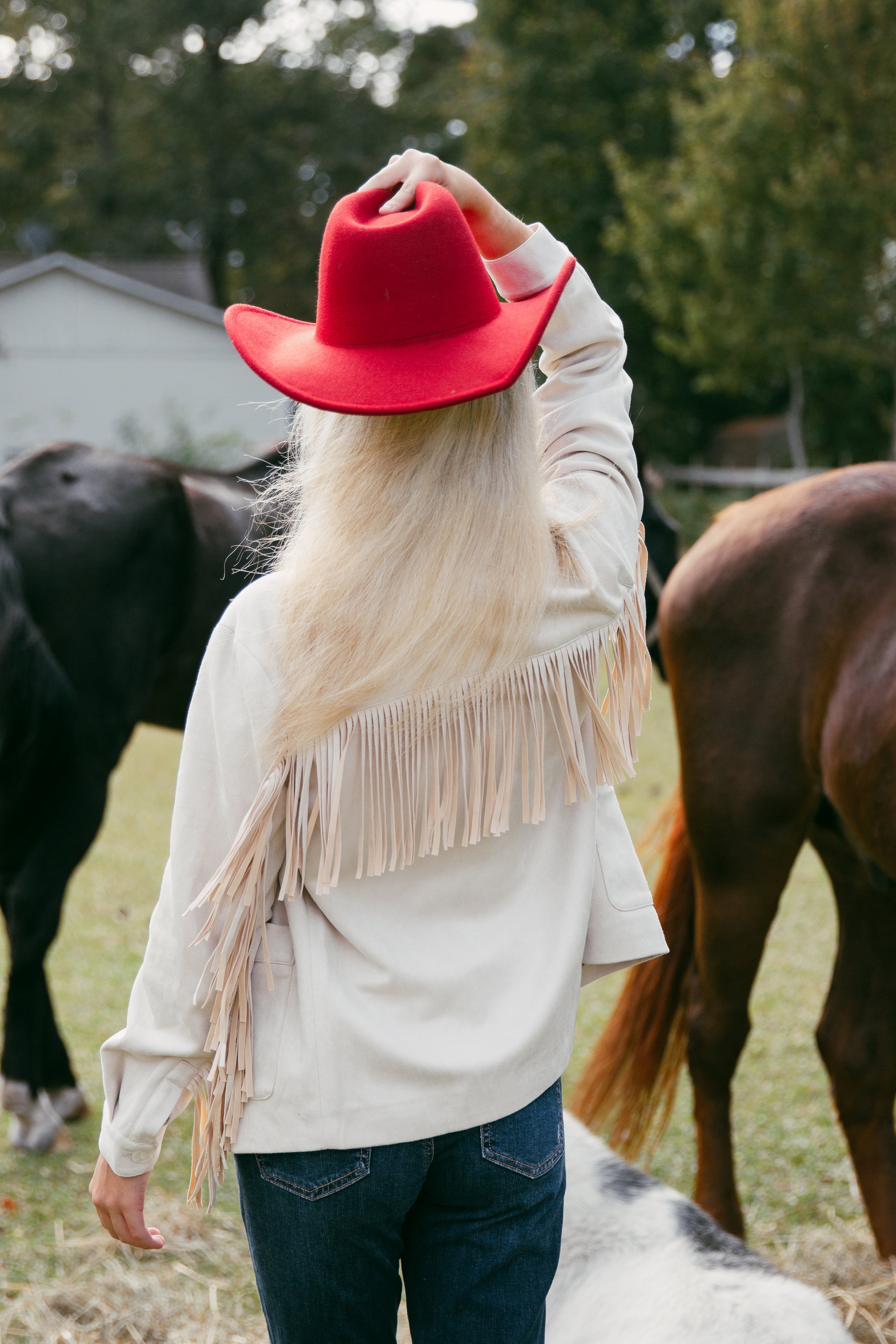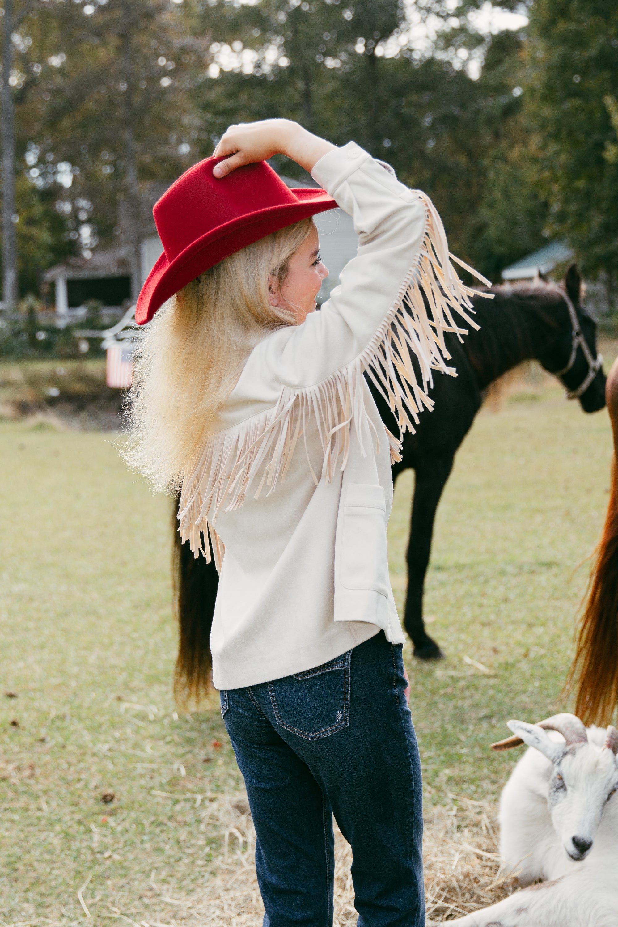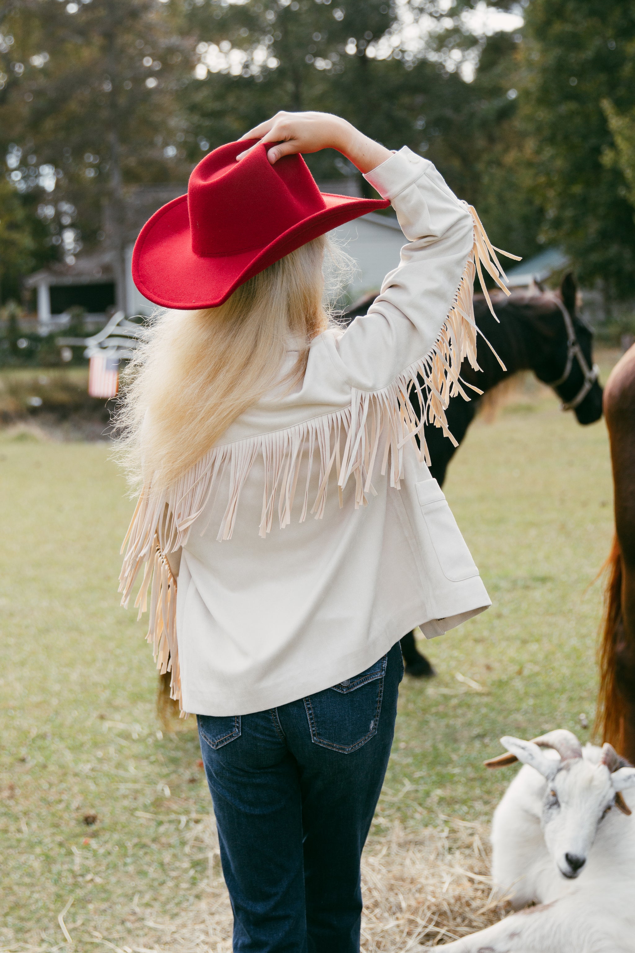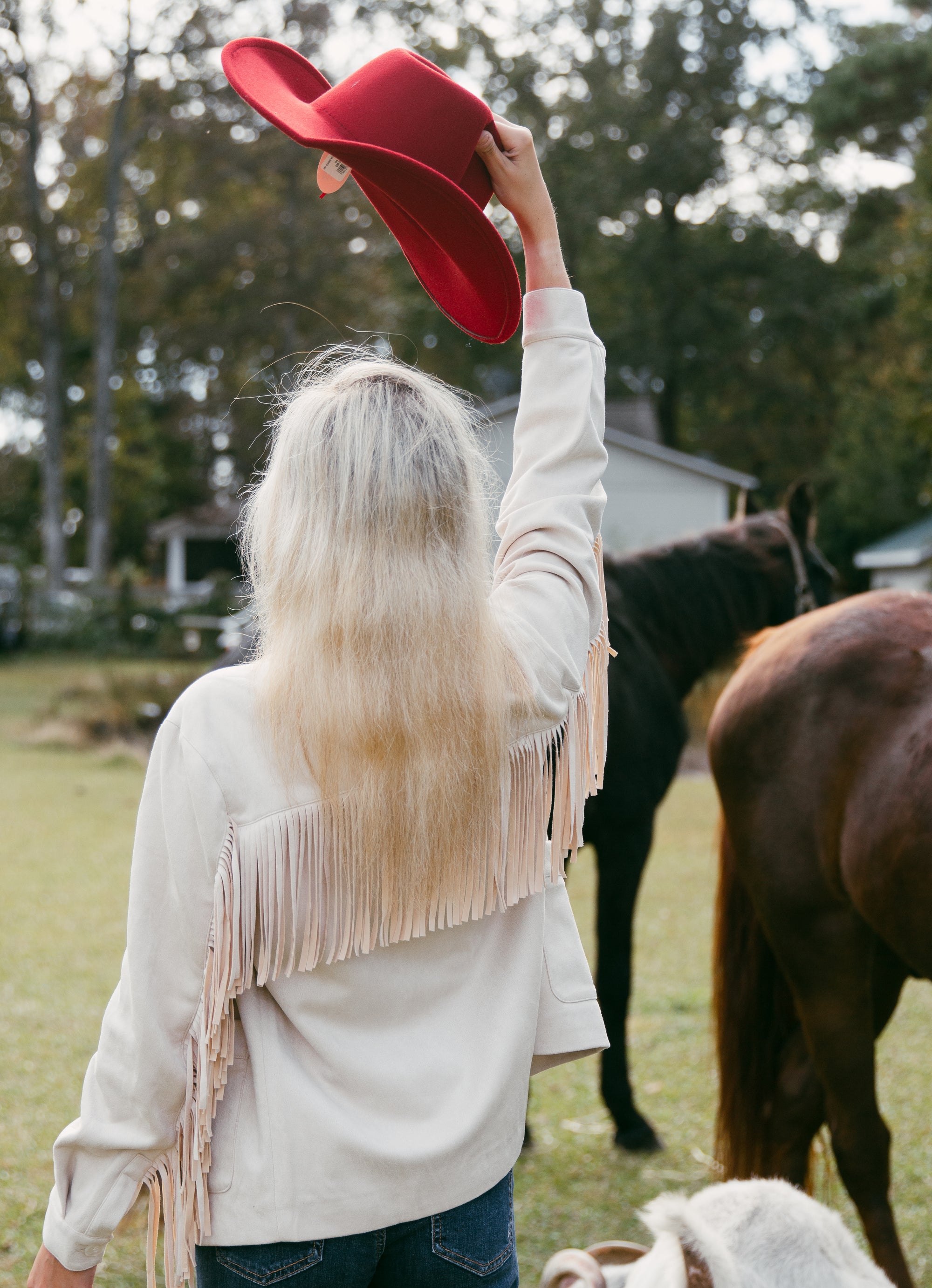 This jacket radiates understated elegance with its light cream hue, perfectly complementing its sumptuous suede material. Fringe details cascade along the front and back, adding a dynamic and eye-catching element to its design. Inside, the jacket surprises with a luxurious snakeskin lining, offering a hint of exotic flair. Practical front pockets not only enhance its functionality but also contribute to its chic and polished aesthetic.