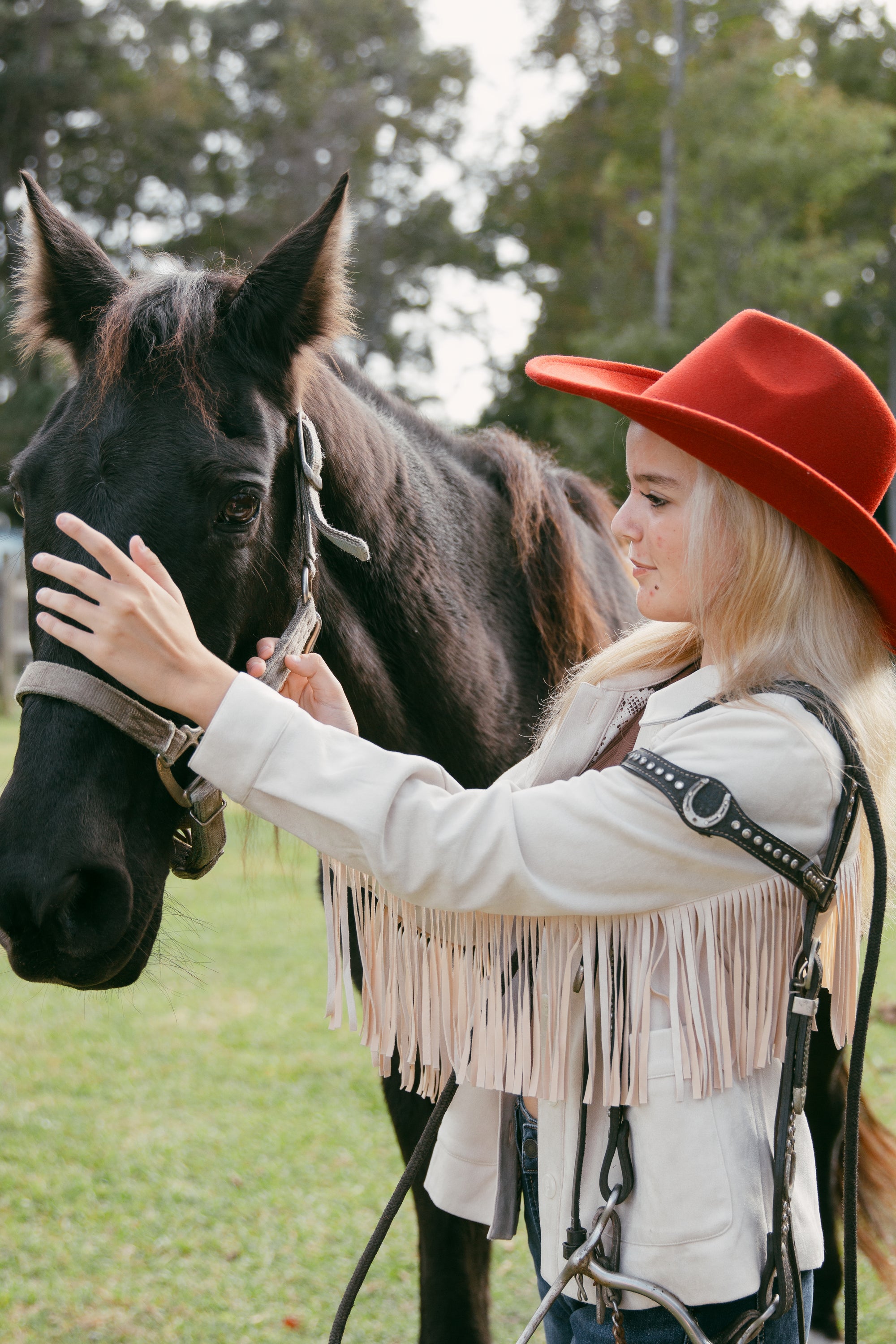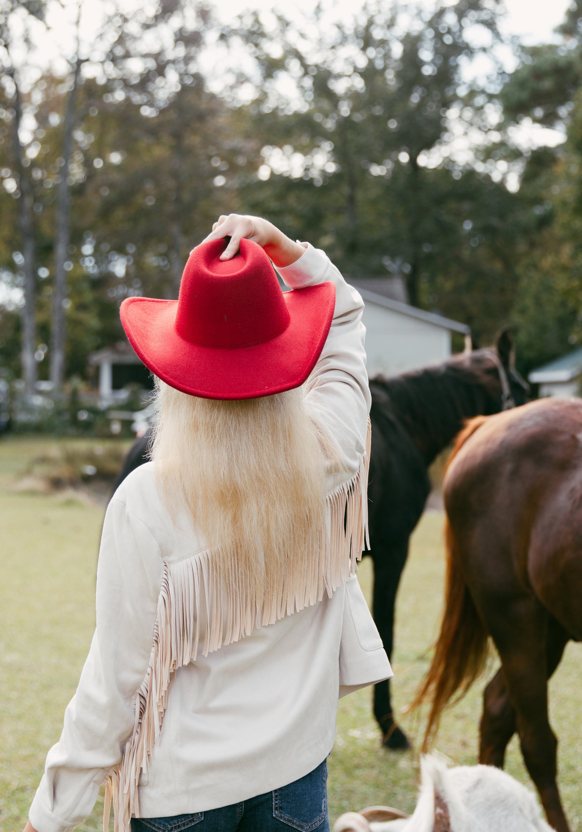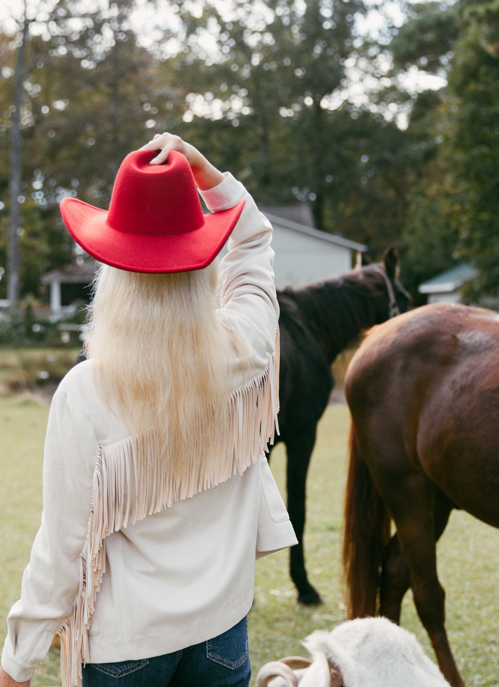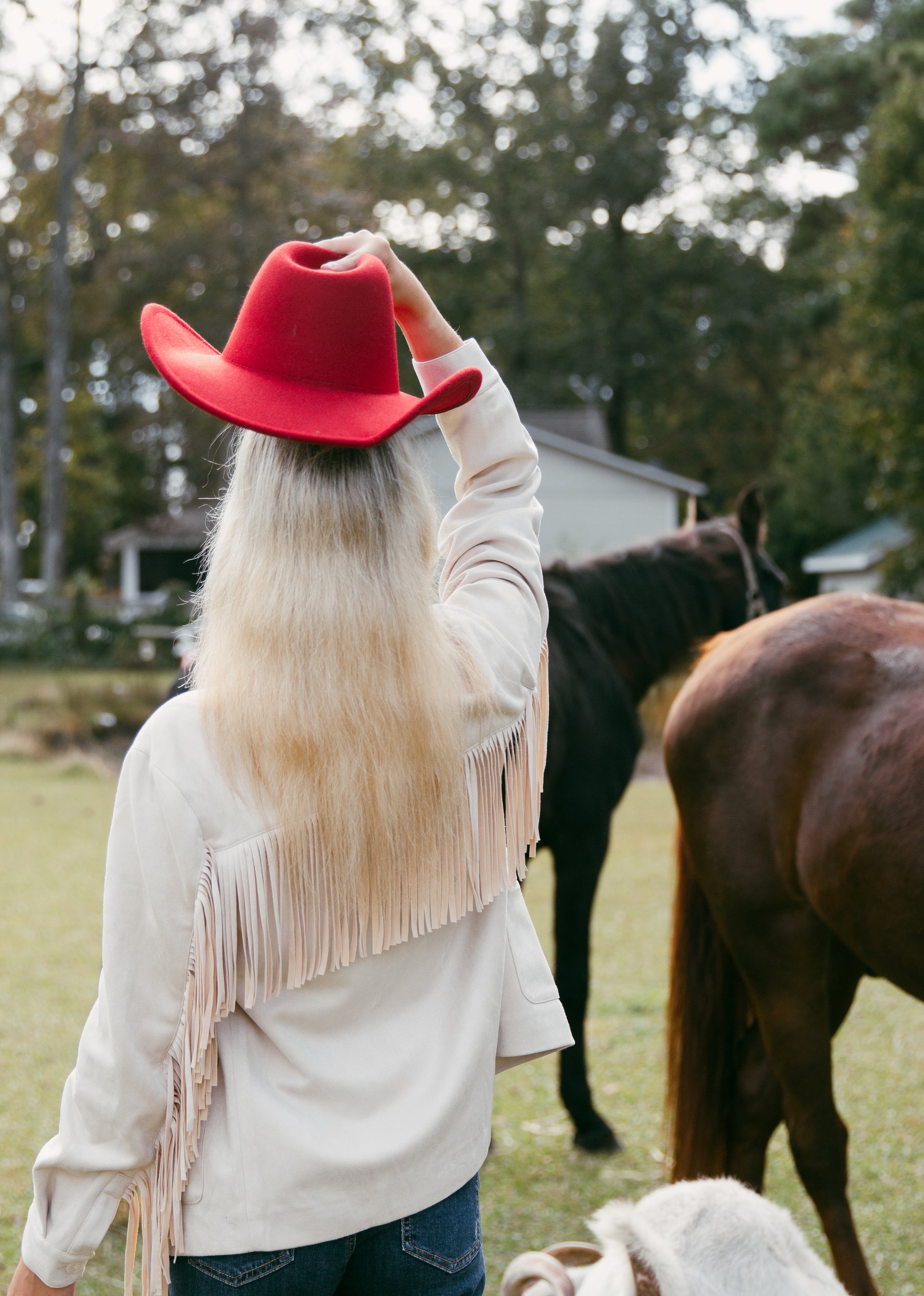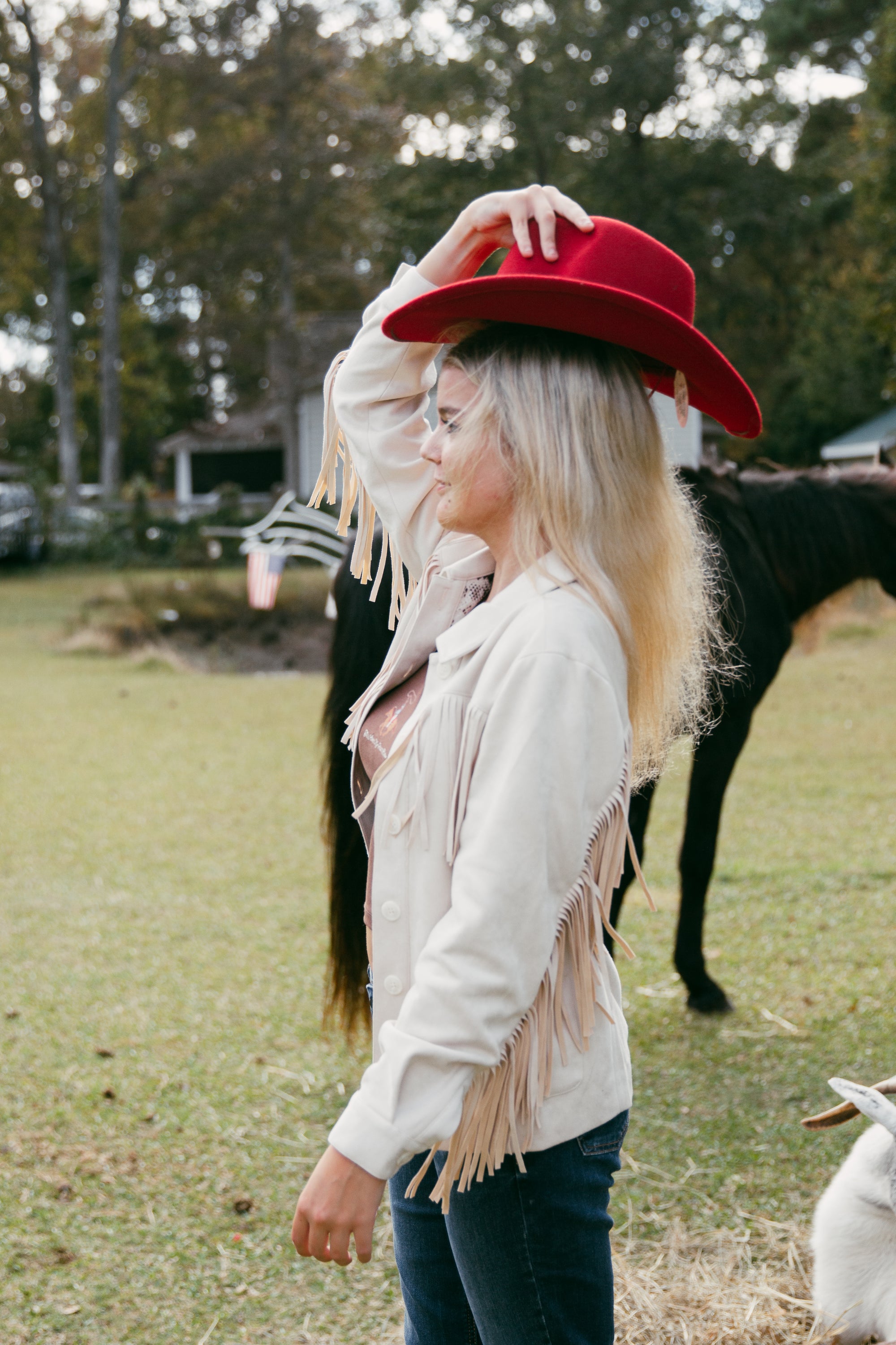 This jacket radiates understated elegance with its light cream hue, perfectly complementing its sumptuous suede material. Fringe details cascade along the front and back, adding a dynamic and eye-catching element to its design. Inside, the jacket surprises with a luxurious snakeskin lining, offering a hint of exotic flair. Practical front pockets not only enhance its functionality but also contribute to its chic and polished aesthetic.