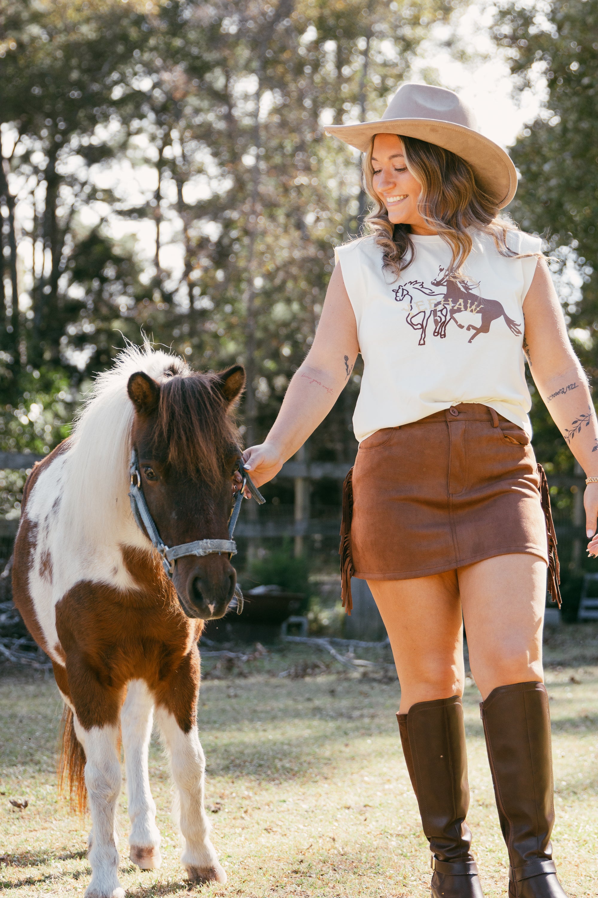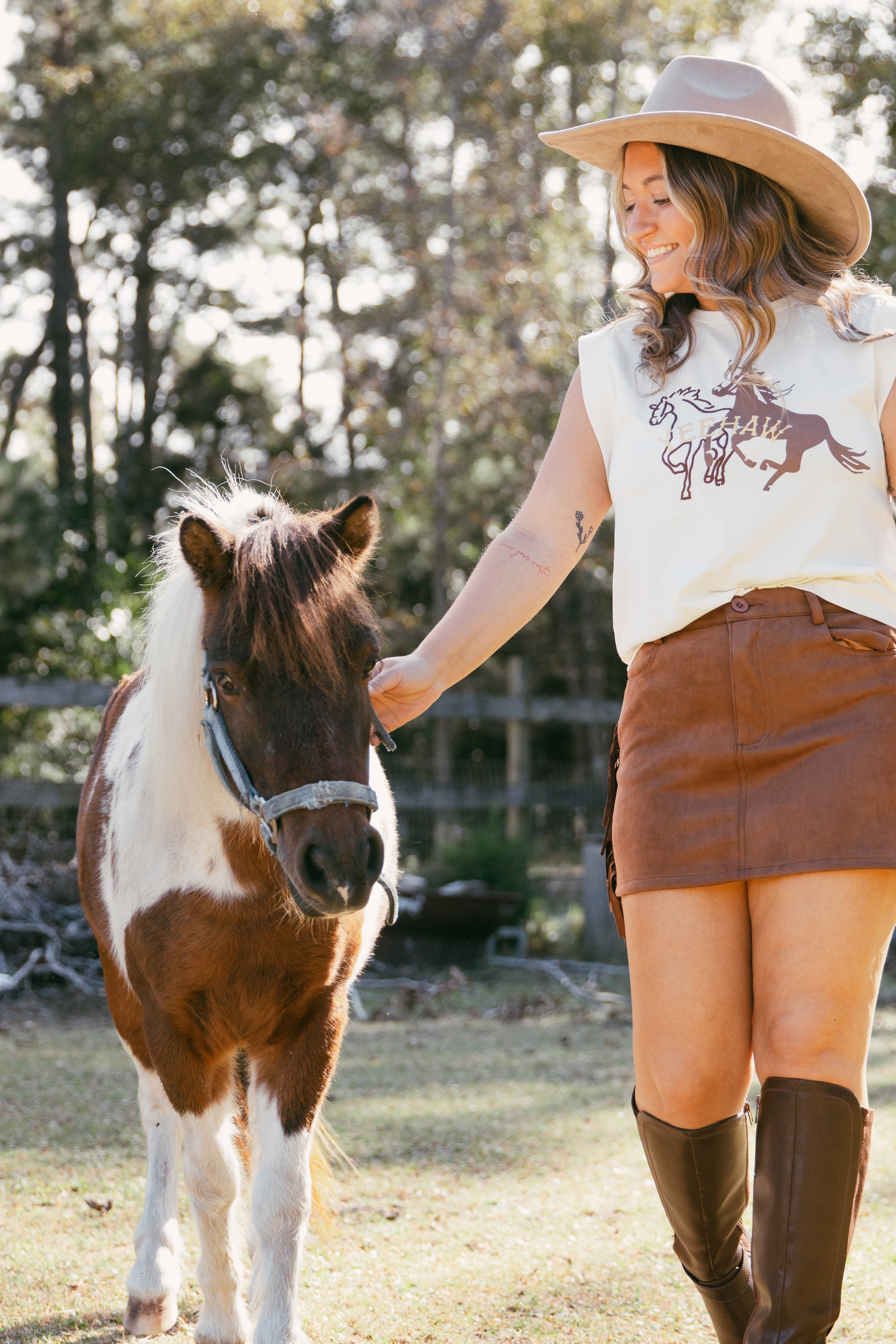 This top showcases a striking graphic horse print accompanied by the playful word “Yeehaw,” capturing the essence of western charm with a modern twist. Designed in a classic sleeveless style, it allows for effortless layering or can be worn on its own for a cool, laid-back look. The versatile design makes it a perfect match for your favorite jeans or a denim mini skirt, easily transitioning from casual daytime outings to evening get-togethers. Crafted from soft, breathable fabric, this top ensures comfort while keeping your style on point.