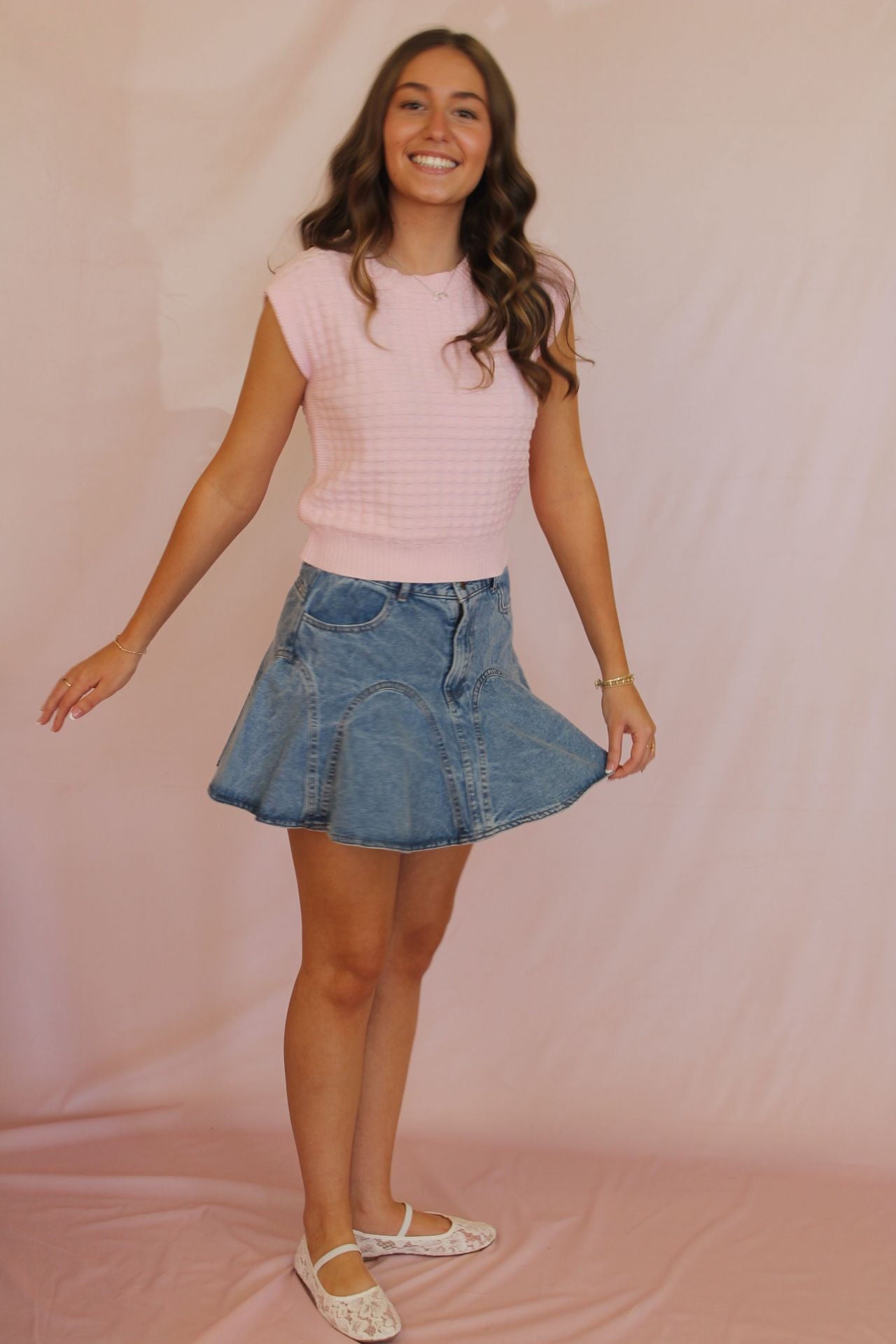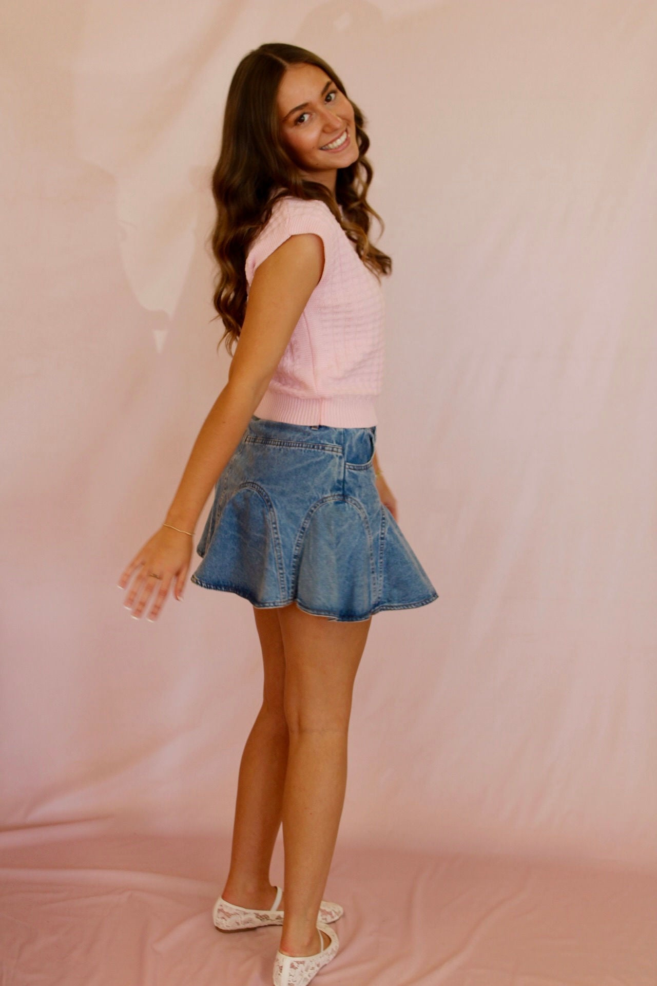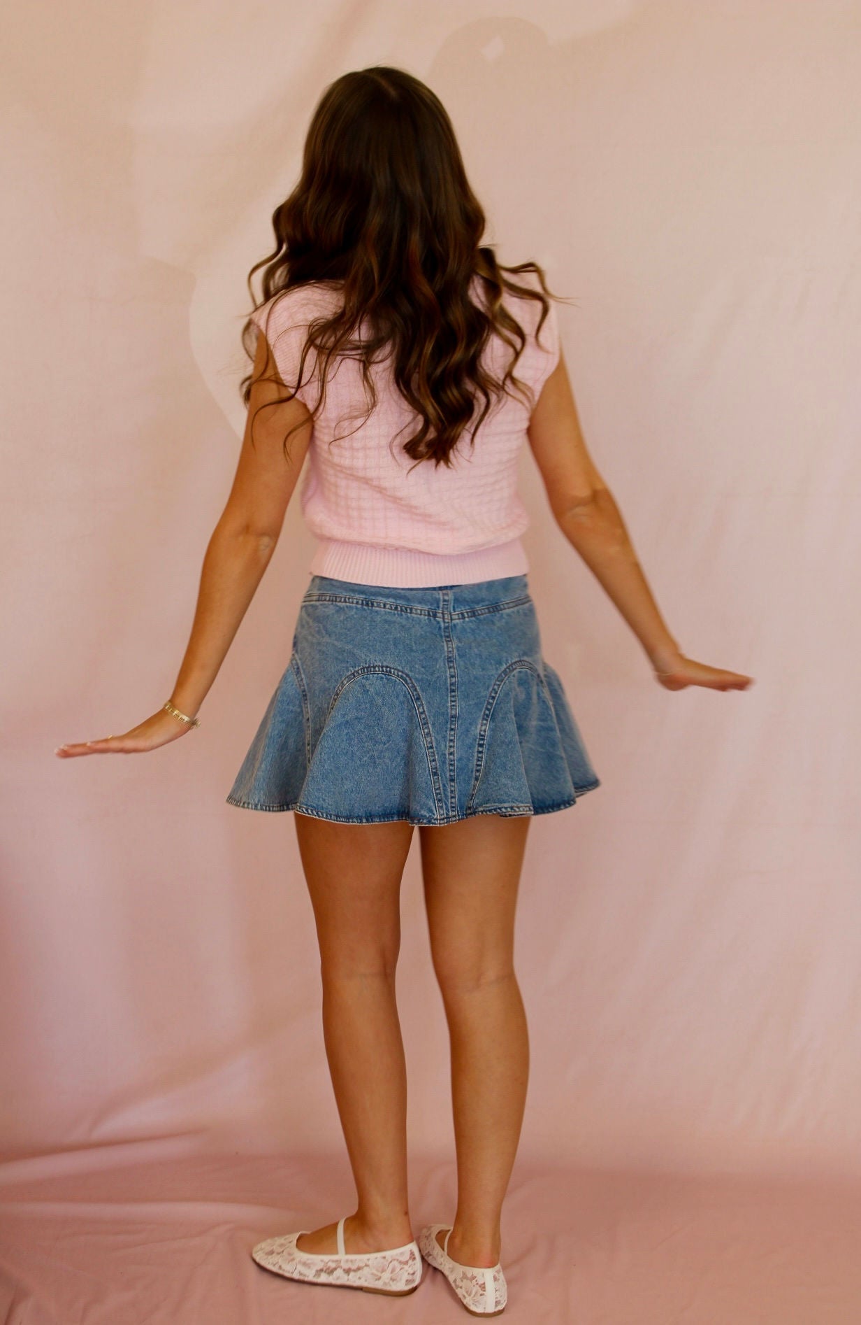 We’re obsessed with this mini skirt, a modern twist on the timeless jean skirt. Crafted from high-quality denim, this skirt features a unique scalloped edge that adds a playful touch to any ensemble. The pleated design enhances its chic silhouette, offering a flattering fit that moves gracefully with you. Perfect for dressing up or down, this versatile piece effortlessly transitions from casual daytime outings to elegant evening affairs, making it a must-have addition to your wardrobe.