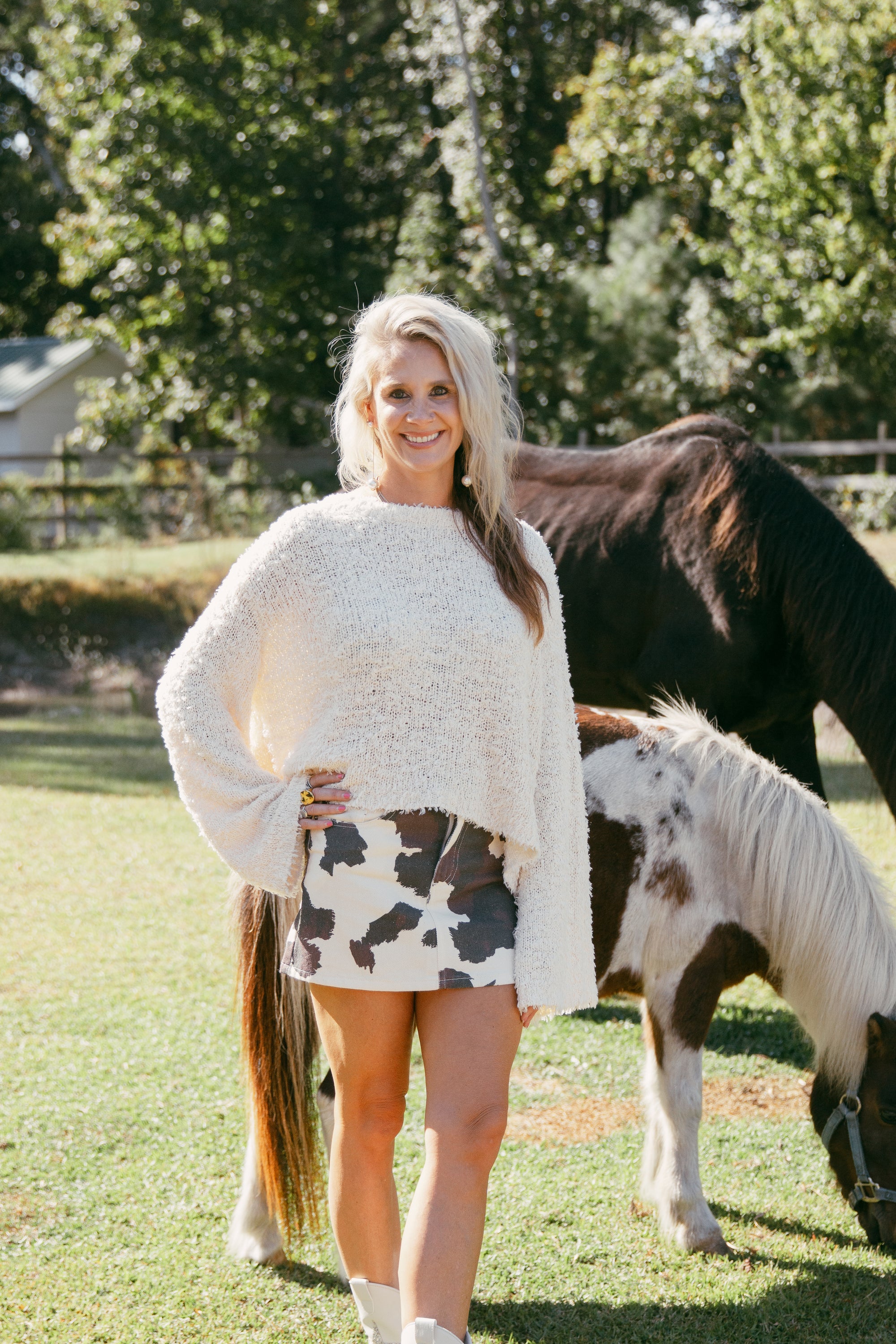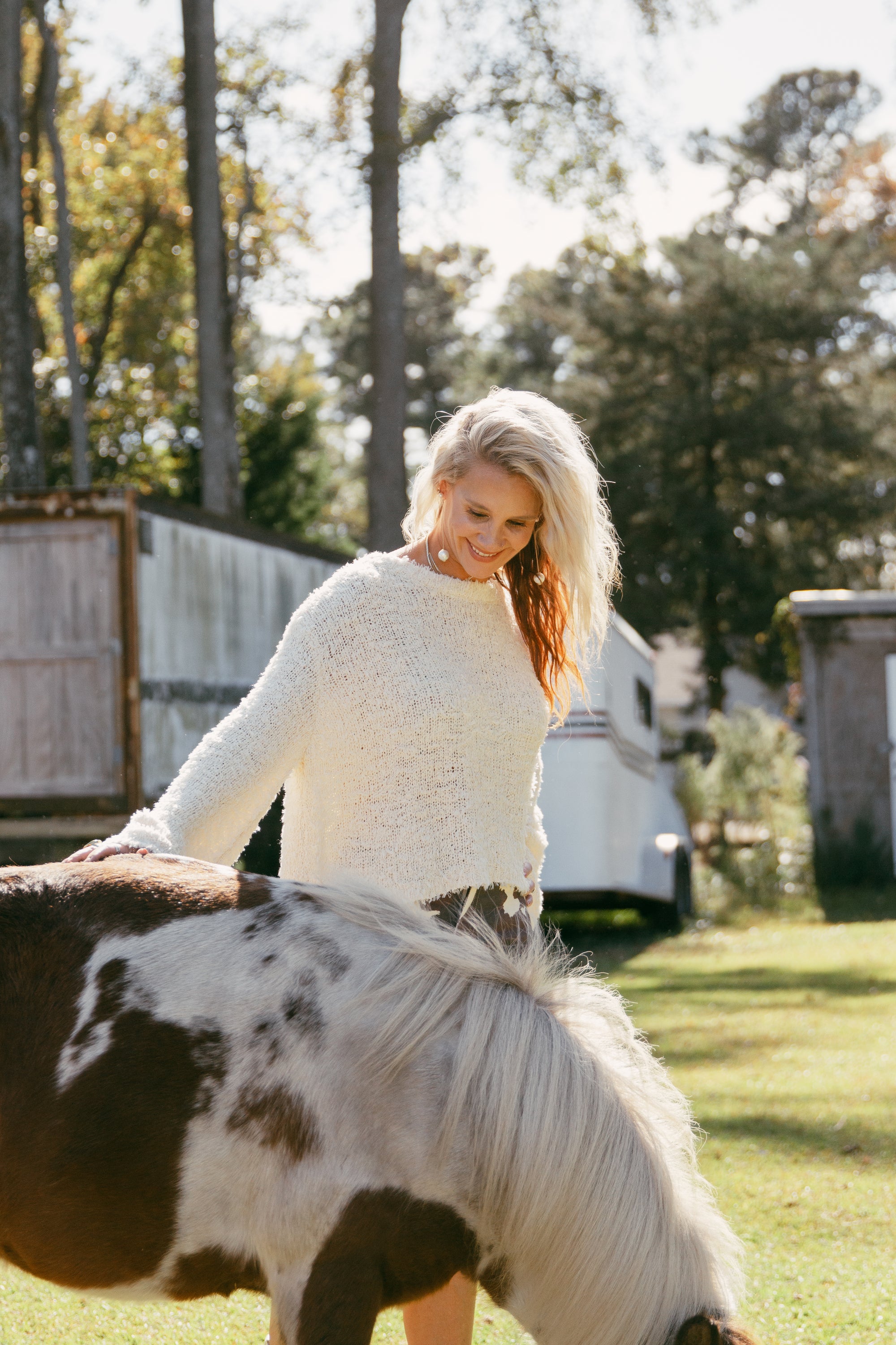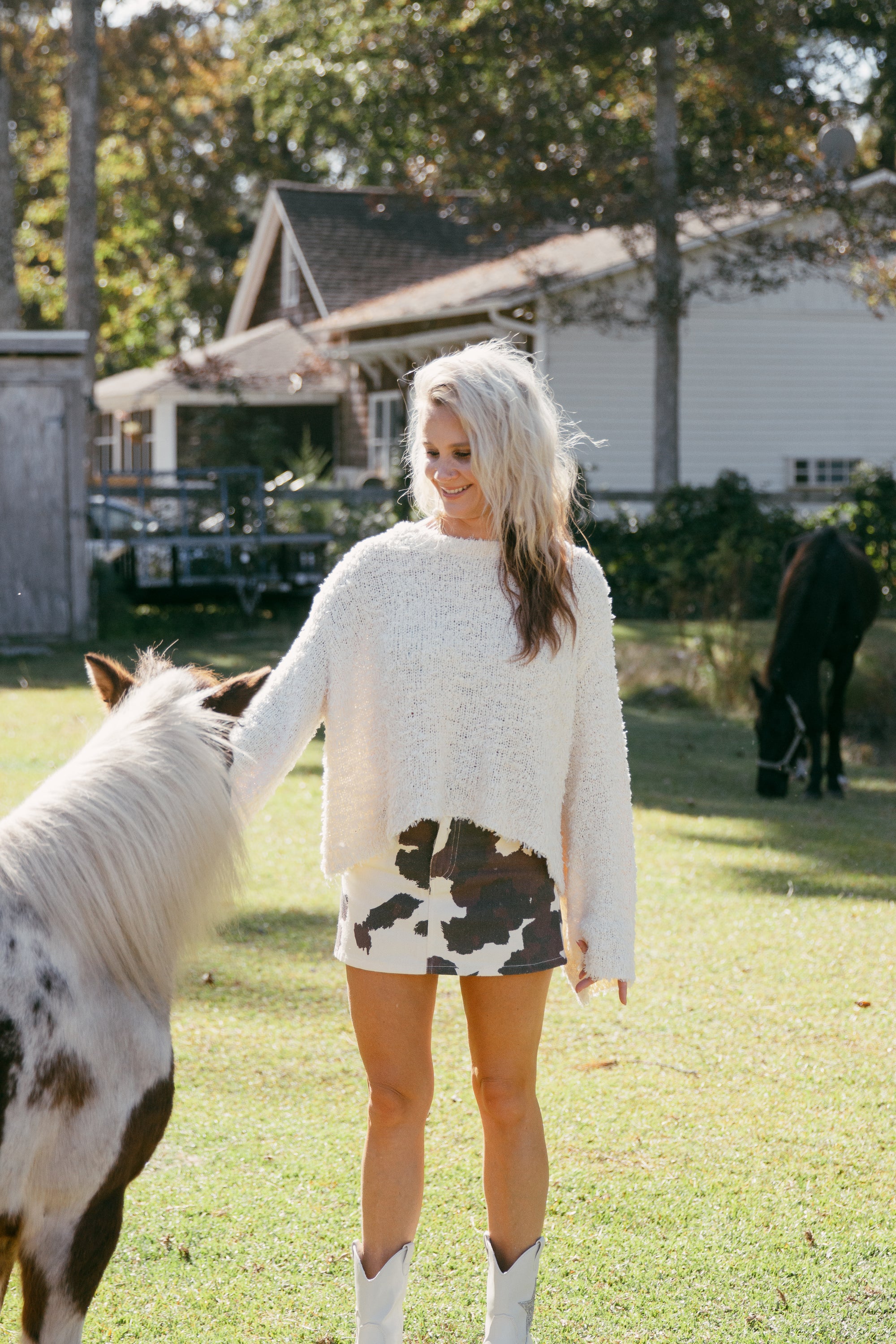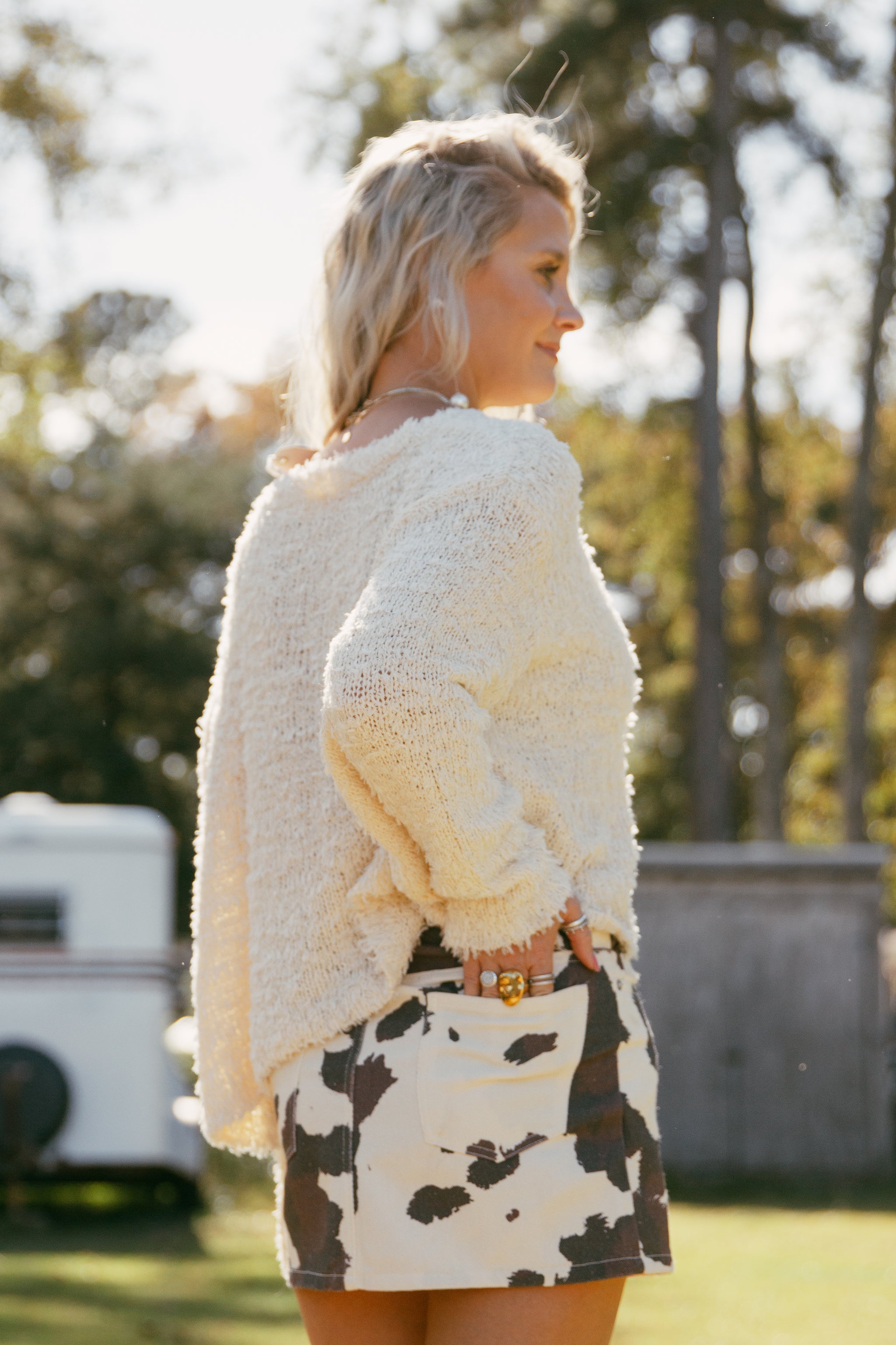 This sweater is crafted from a plush fringe yarn material that offers a unique texture, adding dimension and interest to any outfit. The elegant ivory color provides a timeless and versatile option, making it easy to pair with a variety of ensembles. Designed with chic bell sleeves, the sweater exudes a sense of sophistication while maintaining a playful edge. Whether dressed up with a statement necklace for an evening out or paired with jeans for a relaxed daytime look, this sweater is perfect for any occasion.
