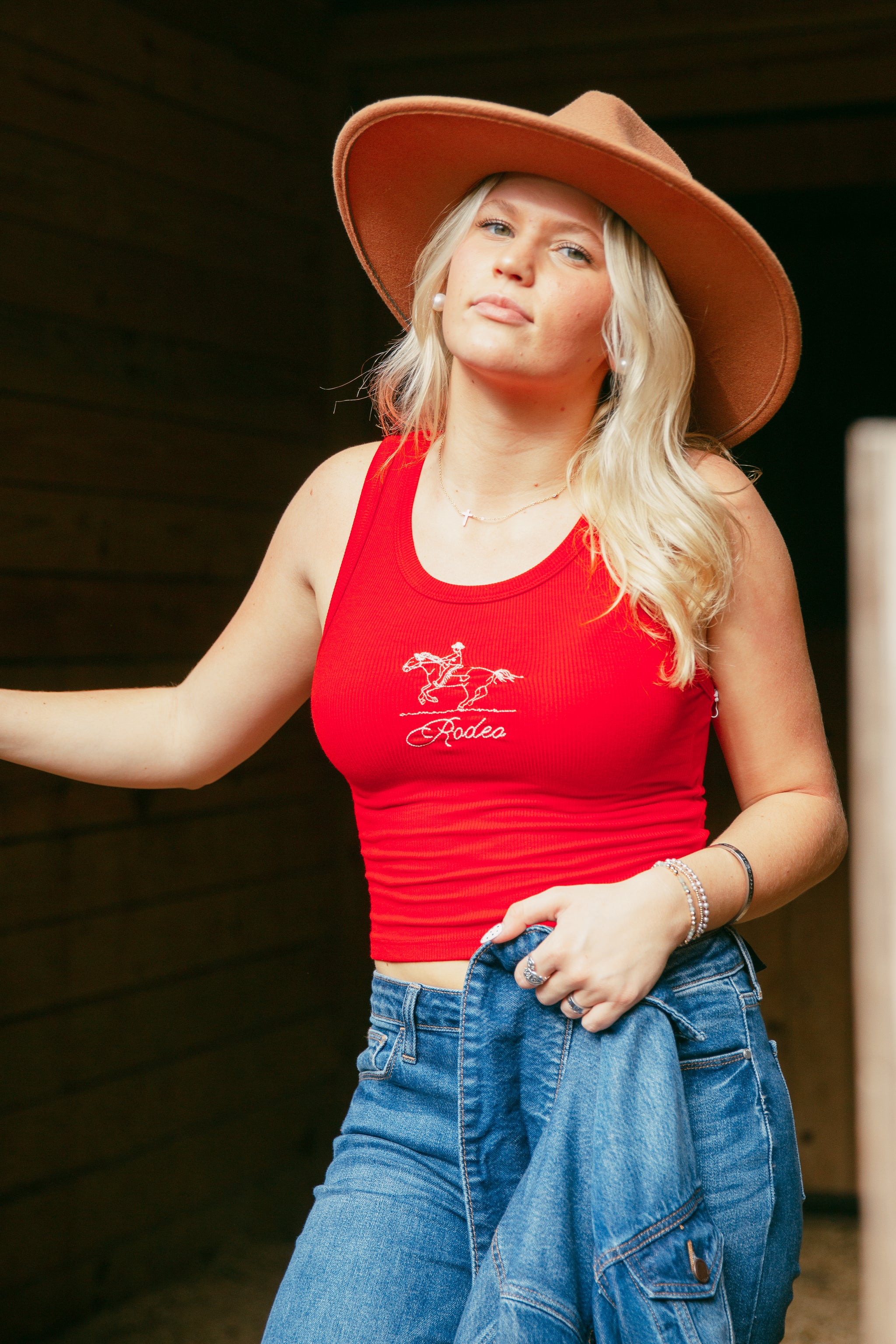 This eye-catching tank top, crafted from a soft ribbed material, offers both comfort and a chic, tactile feel. The vibrant red color exudes energy and confidence, making it a standout piece in your summer wardrobe. Adorning the front is a detailed embroidered rodeo decal, adding a playful and unique touch that captures a spirited Western vibe. Perfect for casual outings or festive events, this tank top pairs effortlessly with denim shorts or your favorite jeans, ensuring a stylish and bold look.