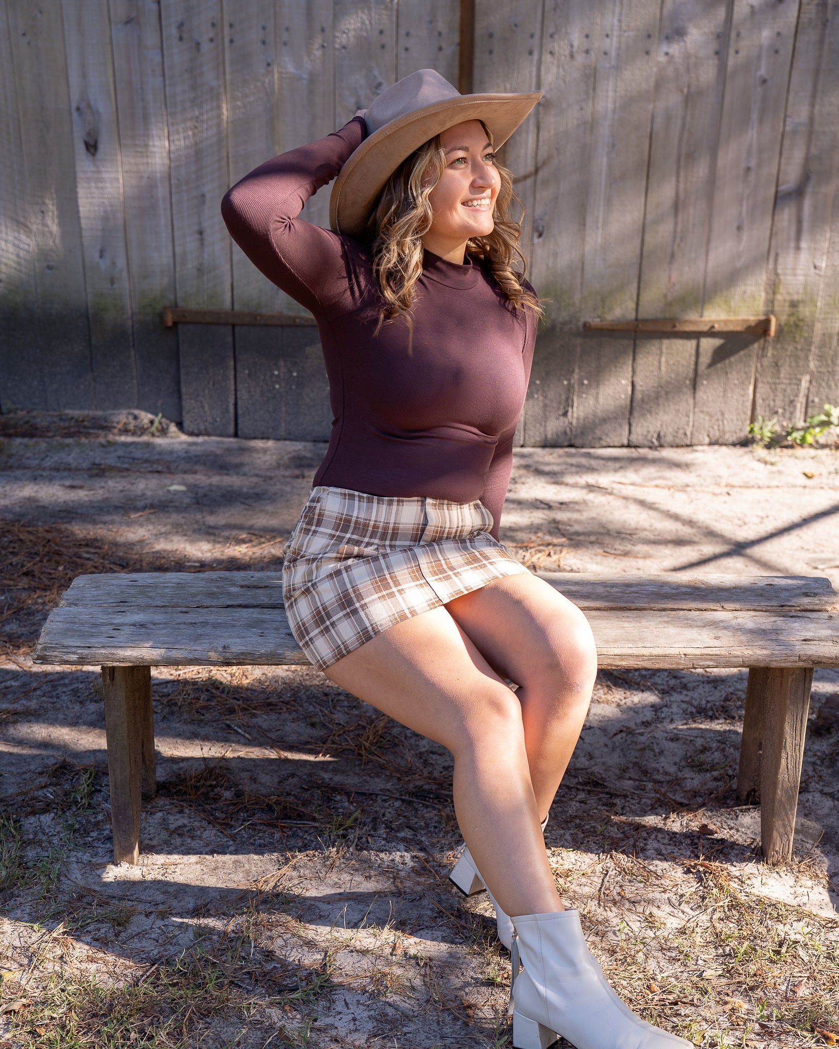 This stylish top boasts long sleeves crafted from a soft and lightweight ribbed material, ensuring both comfort and elegance in any setting. Its mock neckline adds a modern touch, complementing the rich espresso color that exudes sophistication. Perfect for layering, this top effortlessly transitions from casual to chic, making it an essential piece for versatile styling. Whether paired with your favorite jeans for a relaxed look or a mini skirt for a hint of flair, this top promises to be a timeless addition to your wardrobe.