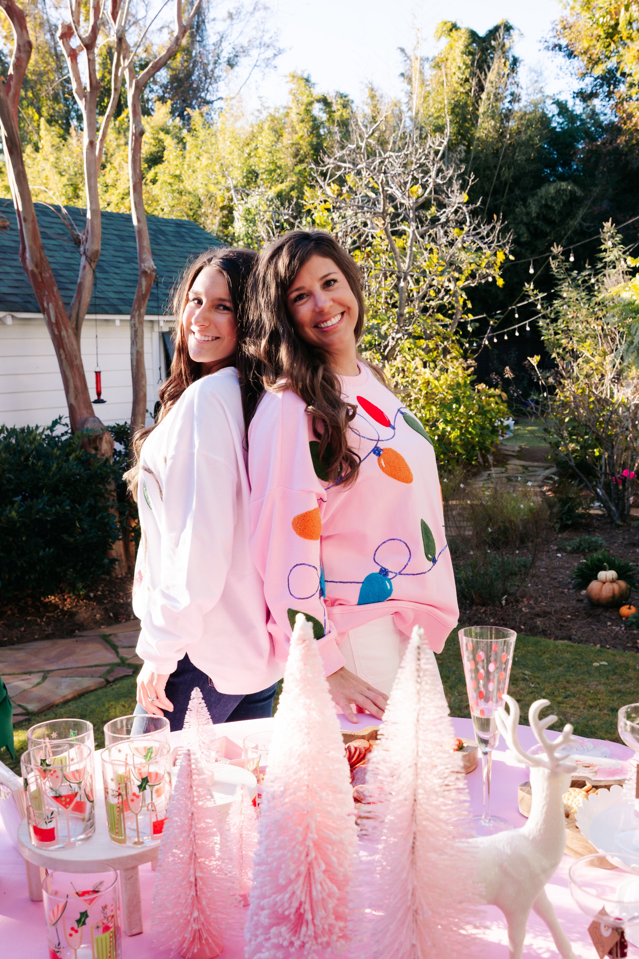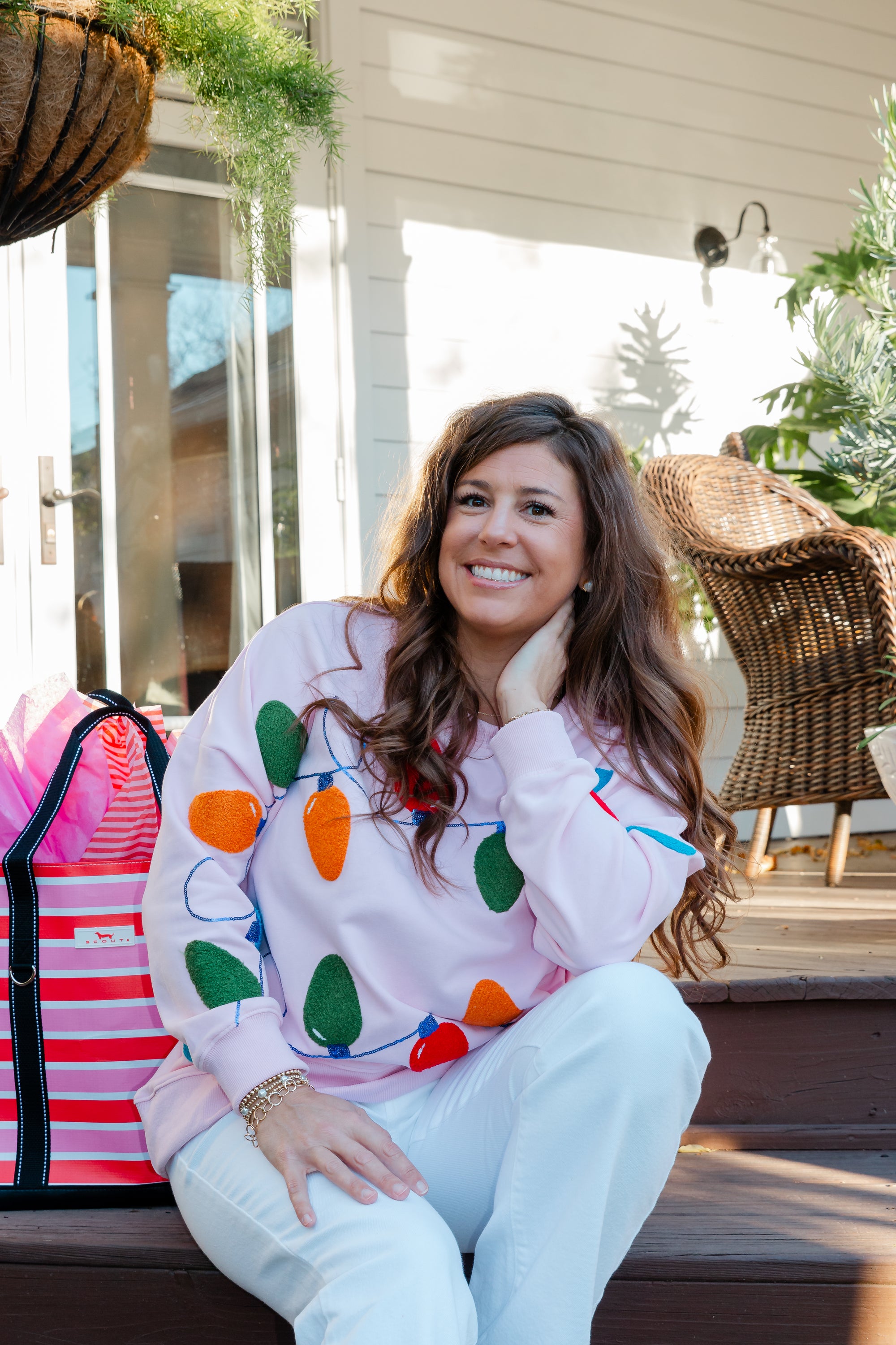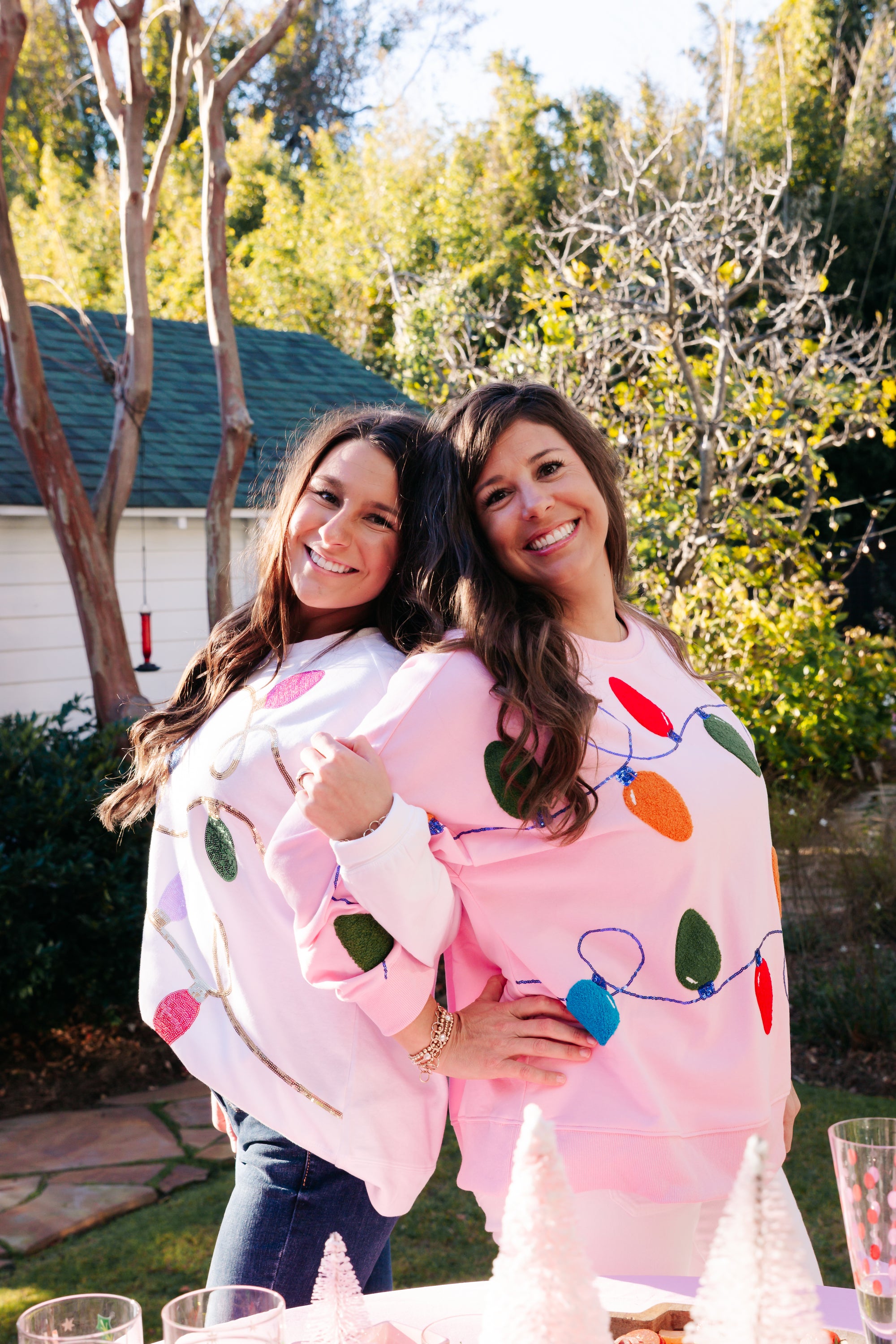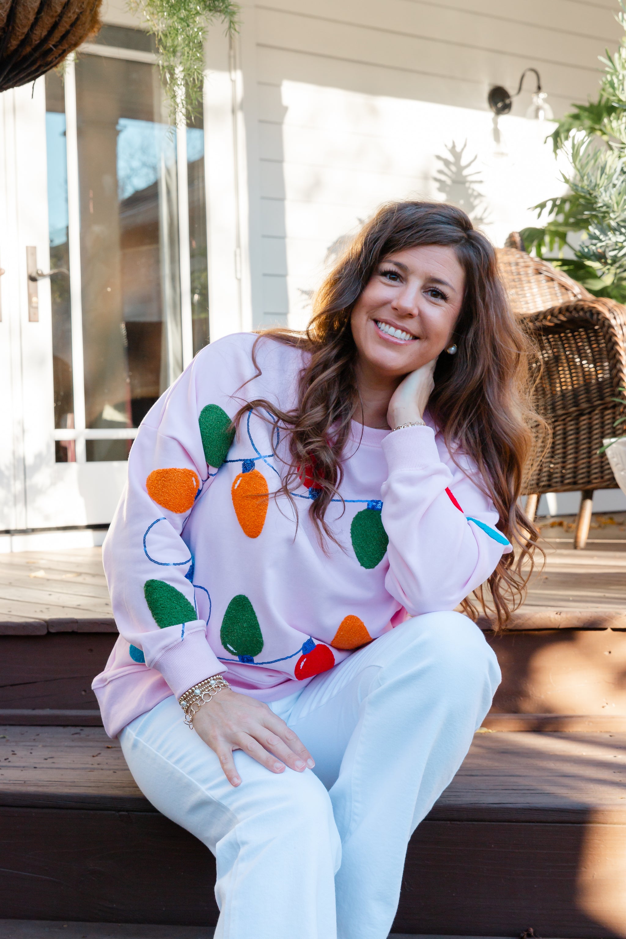 This delightful pullover is adorned in a gentle soft pink hue, creating a warm and inviting feel that's perfect for the festive season. Across the front, swirling holiday string lights add a whimsical touch, with each fuzzy soft light twinkling in a way that captures the magic of Christmas. The sequin wires interwoven among the lights offer a subtle sparkle, enhancing the pullover's elegant charm. Whether you're sipping hot cocoa by the fire or mingling at a holiday party, this top is an ideal choice that combines comfort with festive cheer.
