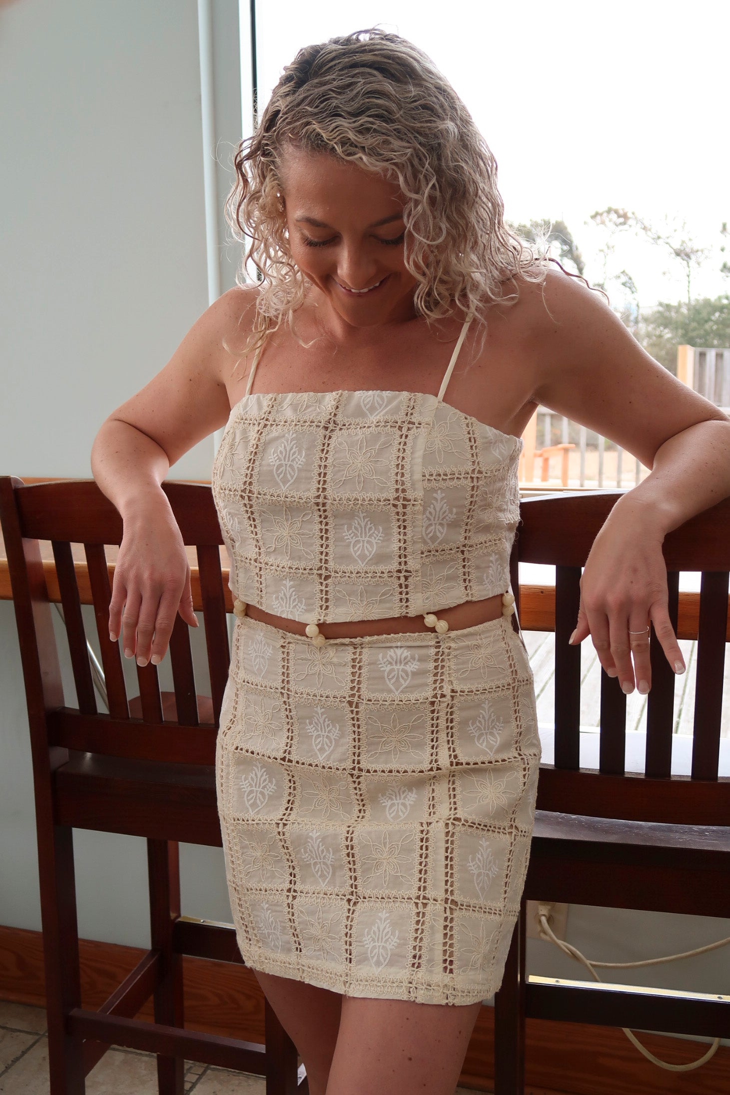 This exquisite dress is crafted from a beautiful woven material that showcases square stitching, adding texture and interest to its design. Each square is adorned with delicate embroidered florals, enhancing the dress's charm and elegance. The lovely natural color gives it a serene, earthy appeal, making it perfect for various occasions. At the waist, beaded macrame-style details provide a beautiful, artisanal touch that highlights the dress's sophisticated craftsmanship.
