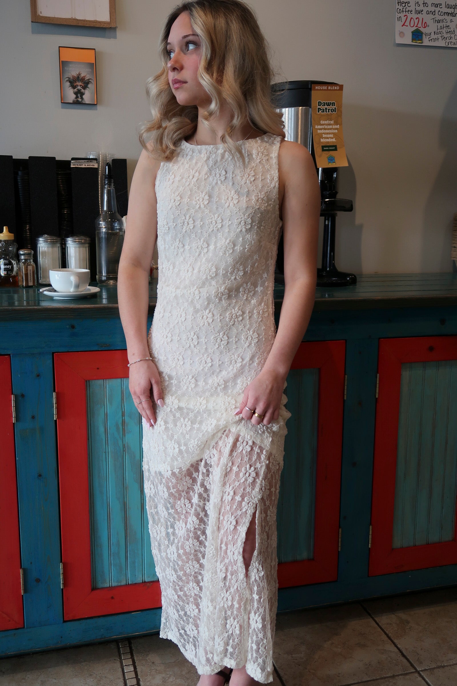 This stunning dress is crafted in an ivory color that exudes elegance and sophistication, making it an ideal choice for brides or any special occasion. Its slightly fitted silhouette gracefully accentuates the body's natural curves, offering a flattering and refined look. The beautiful lace overlay material adds a touch of romantic charm, while enhancing the dress's delicate and intricate design. Perfect for weddings, concerts, and all things spring, this dress is a timeless piece that embodies both grace and style.