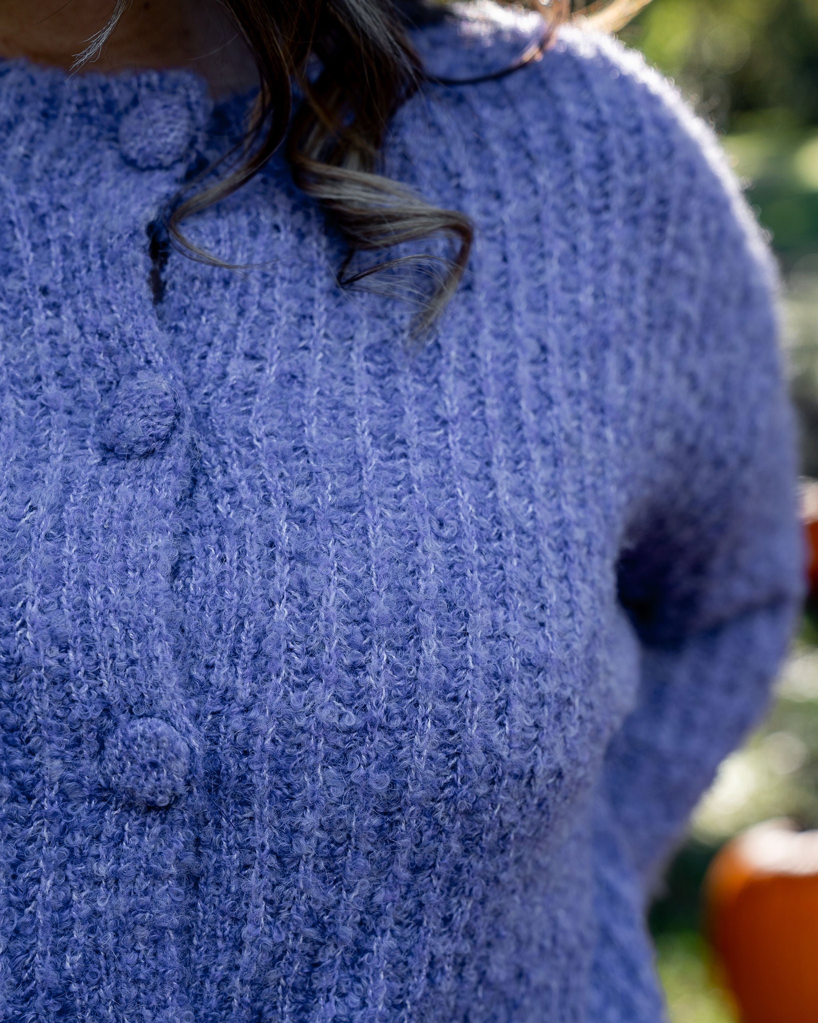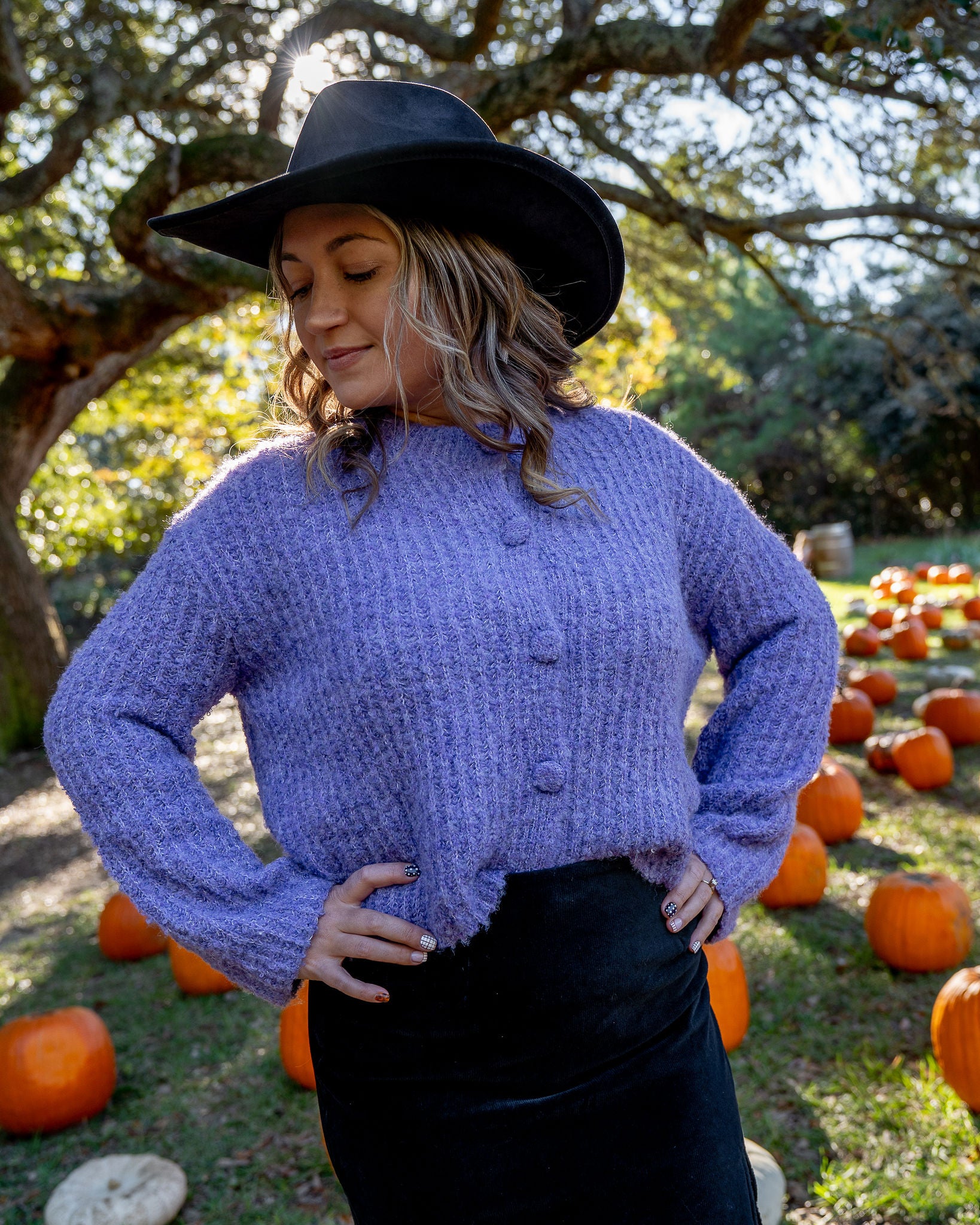 This sweater is crafted from a super soft knit material that wraps you in warmth and comfort, making it an ideal choice for the crisp fall season. The design includes buttons down the front, allowing for versatile styling options whether you choose to wear it open or closed. Its chunky knit texture adds a layer of coziness and visual interest, perfect for snuggling up on chilly days. The bold purple hue brings a pop of color to your wardrobe, making it a standout piece for autumn.