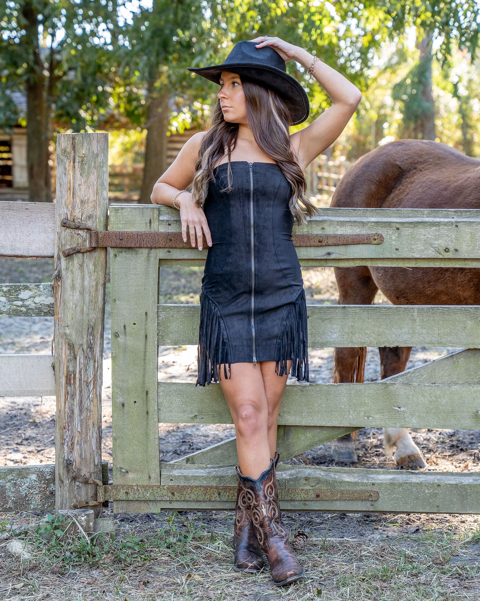 This dress features a sleek strapless design that beautifully showcases the shoulders, creating an effortlessly chic look. Crafted from soft black suede, it offers a luxurious feel and a striking appearance that is perfect for making a statement. The zipper up the front adds a modern touch, providing both style and convenience. Fringe details on both sides of the dress introduce an element of playful movement, making it an ideal choice for your next concert or night out.